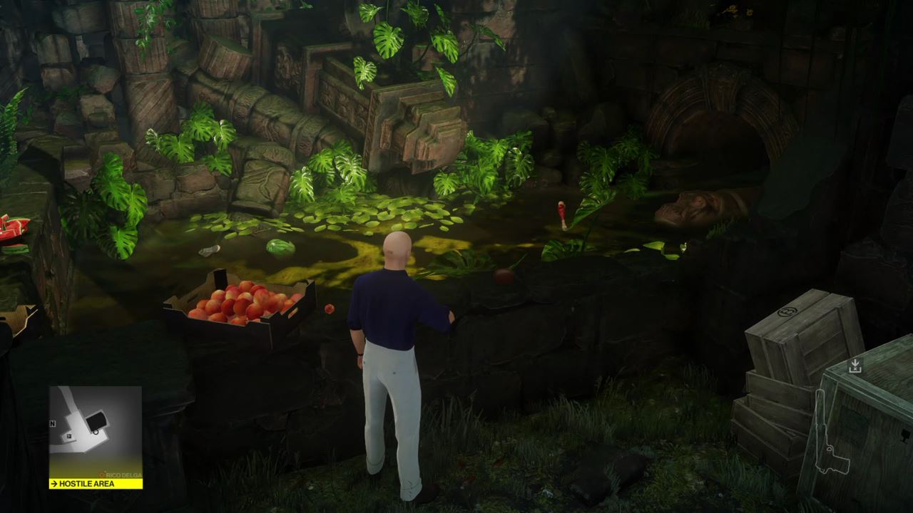Cross the log, sneak past the guards in the altar hallway, and enter the Hippo Pen. Knockout the sole guard and hide him in the trunk. Don’t kill him!