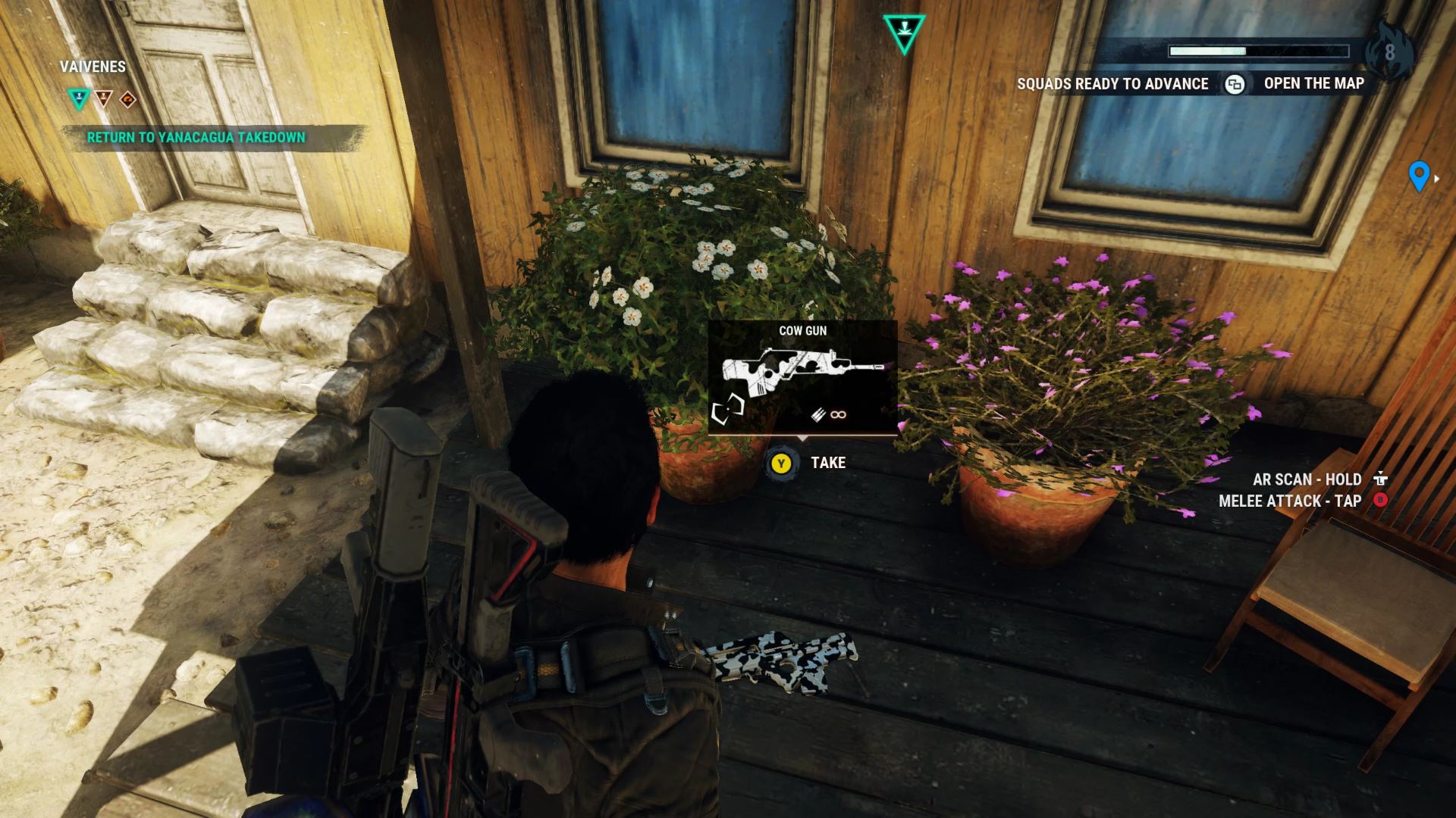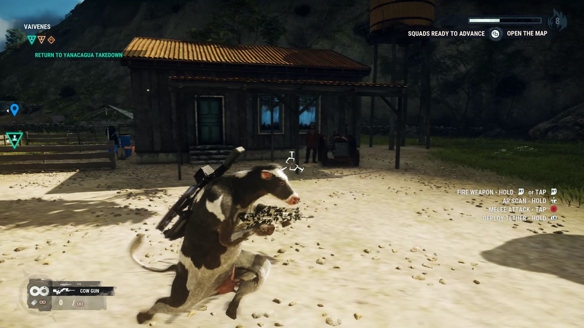 To get the Cow Gun, drop down into the Vaivanes region, in the southwest edge of the island map. Drop down to the farm (shown in the image above) and you’ll find the Cow Gun on the porch. The farm is located just north of the base smack in the center of the region.