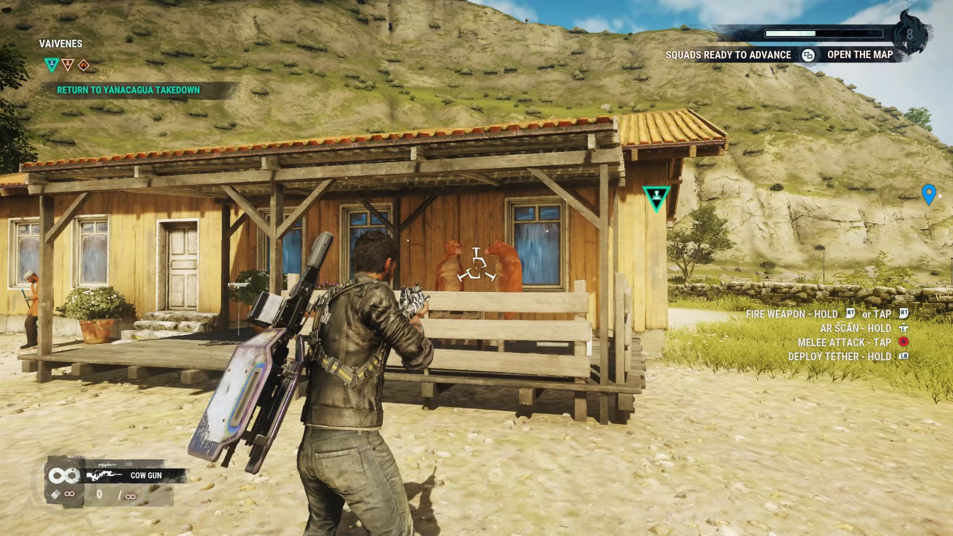 The gun can’t actually kill anyone. Shooting people turns them into brown cows, complete with a cow bell sound effect whenever you chance someone. They go about their lives normally — as a cow, they still do human things. Stand up like a human, play music like a human, drive cars, shoot Rico, etc.