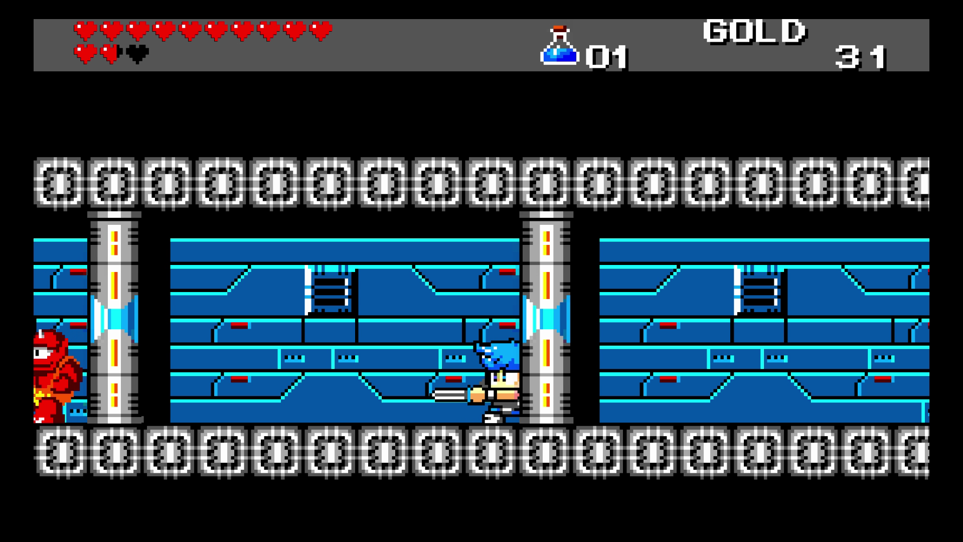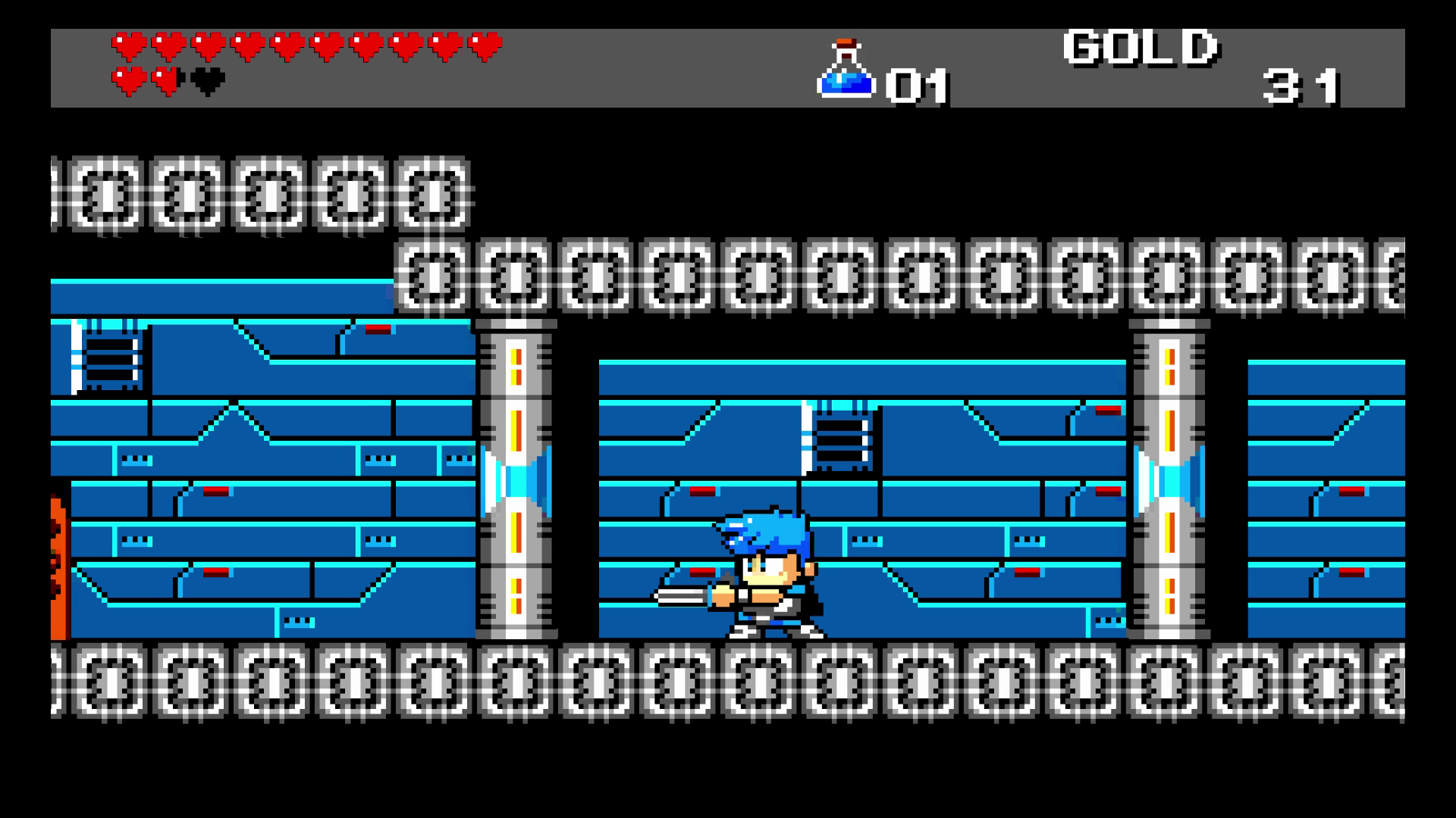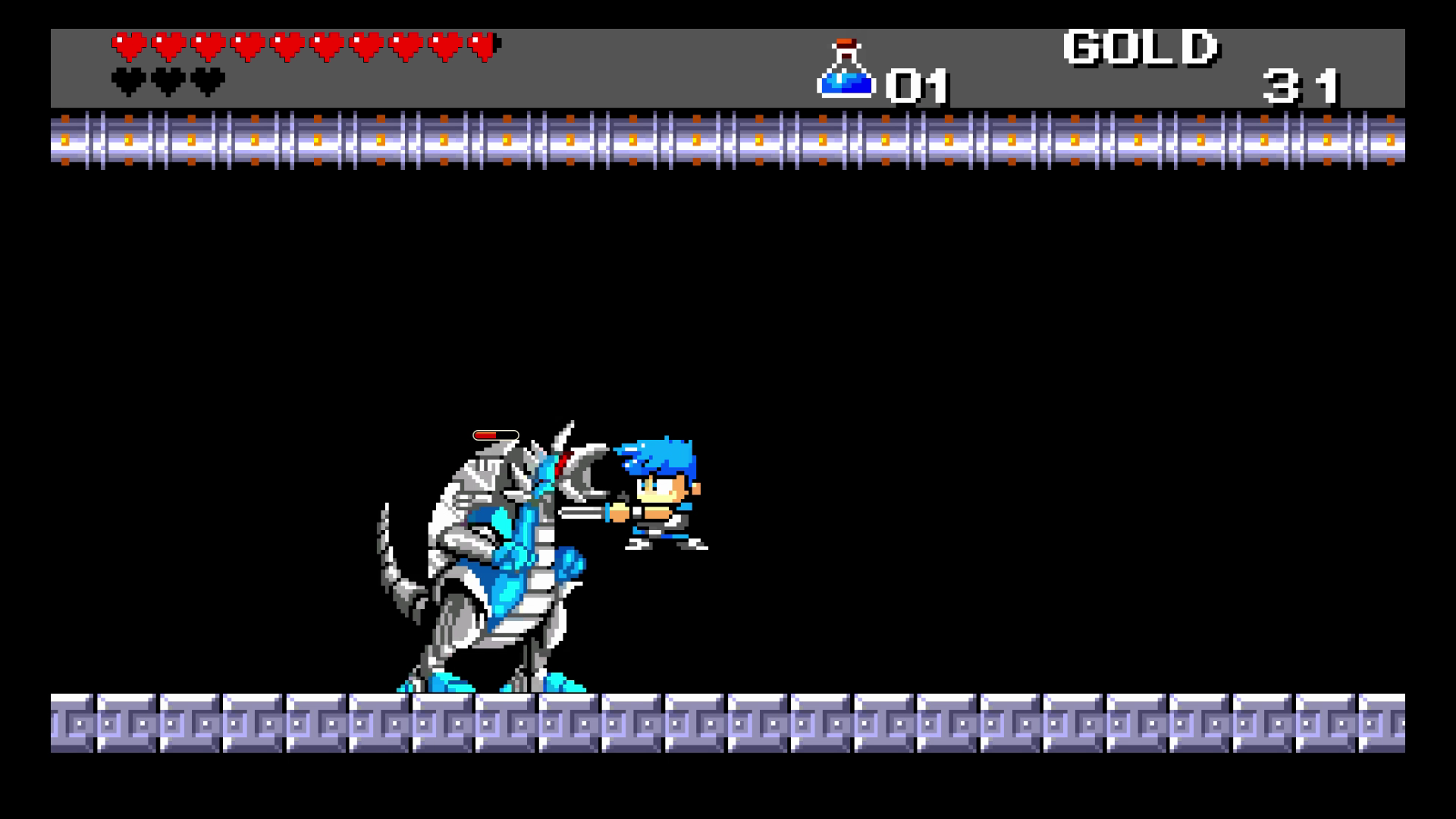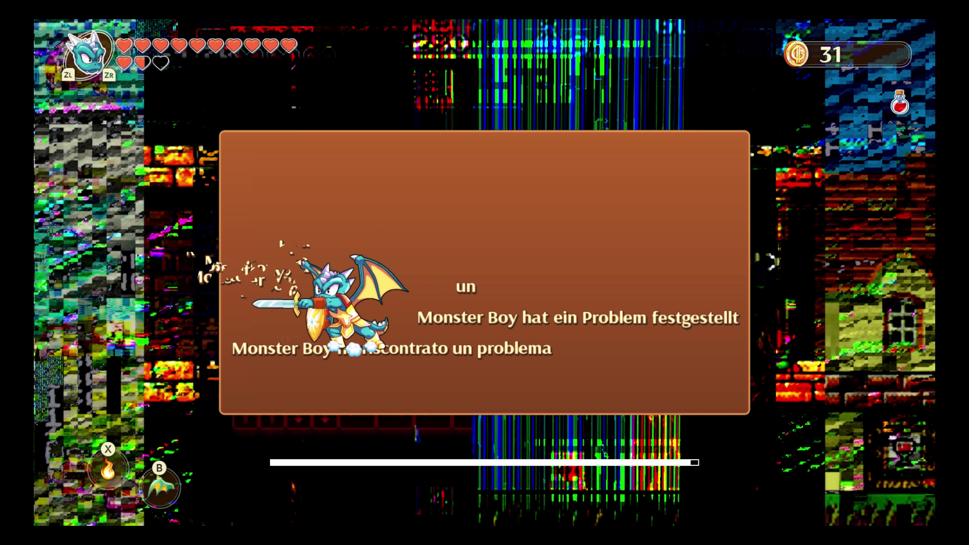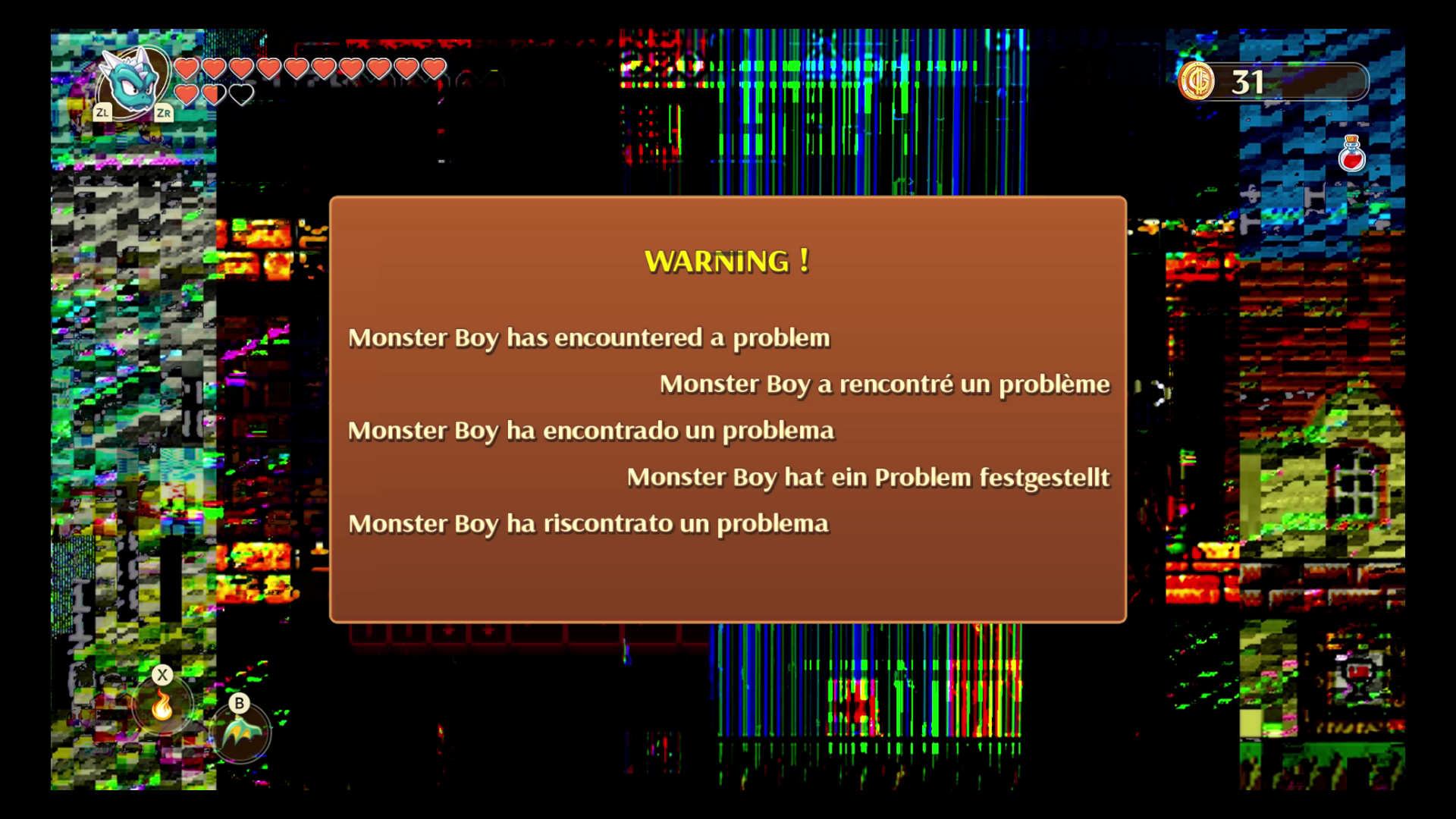 Use the console and you’ll enter a glitched-out area with a warning message, stating that something has gone wrong. After a few moments, you’ll appear inside the warning message, where you’ll be able to smash through all the text — in all five different languages. Destroy all the text to enter a Mega Man / Zelda 2 retro adventure, with hearts and gold meter at the top of the screen.