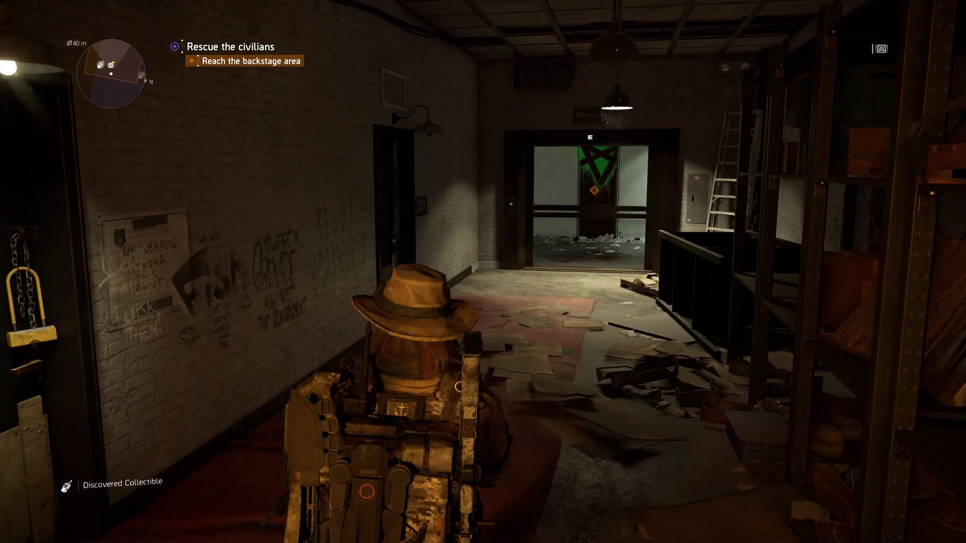 Collectible #3: In the underground of the theater, you’ll reach a hallway leading to a one-way elevator. To the left, there’s a locked door. Shoot the lock off to find a collectible in the room.