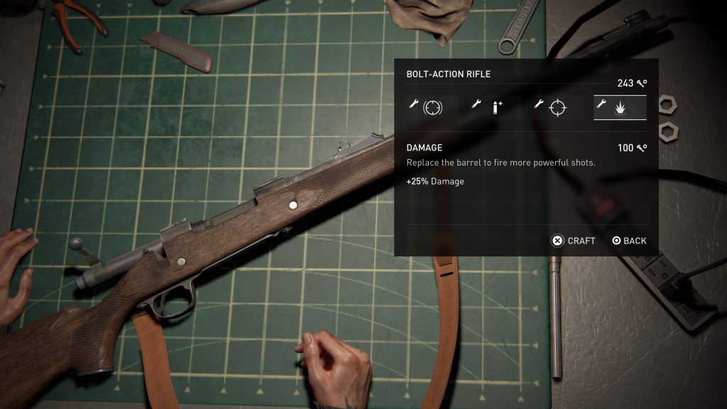 As you collect weapon parts, you’ll be able to upgrade your guns in a variety of ways. In TLOU2, your weapons are generally better than the previous game, so I don’t highly recommend weapon capacity. You’ll want to save up for Damage upgrades first — these often have accuracy or stability upgrades too.