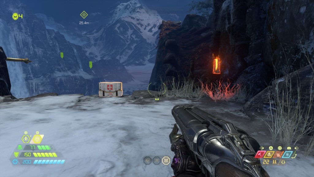 Map: Reaching the large open snowy combat area, you’ll have to navigate a jumping puzzle and cross a gorge with a Cyber Mancubus guarding the other side. The map terminal is near that Mancubus spawn.