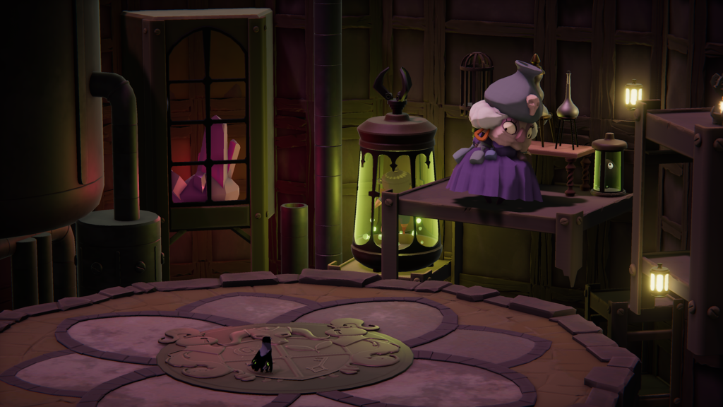 To reach the Urn Witch’s Basement, light both urns to the left / right of the purple door in the Main Hall of the Mansion using your new Flame Spell. Use the [Key] we acquired earlier, and then ride the lift down.