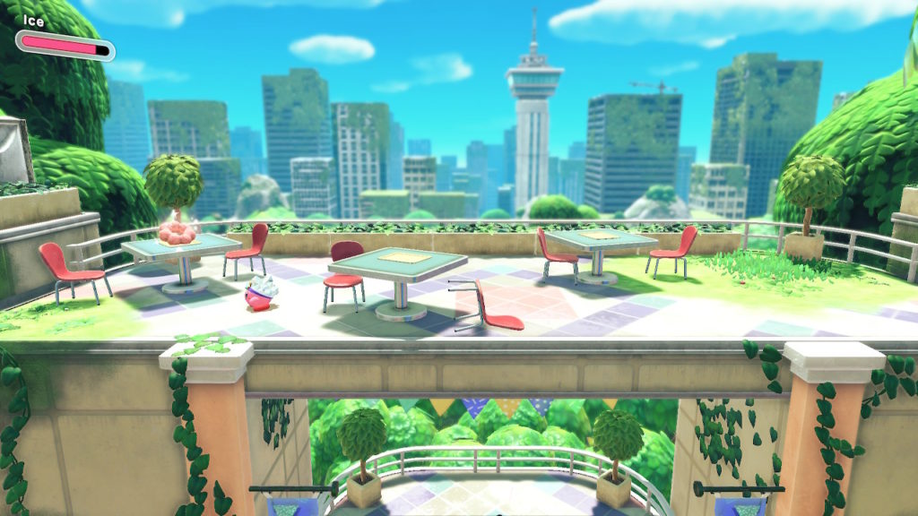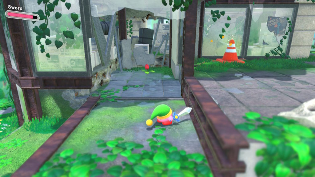 - Waddle Dee #3: To the left, climb the ladder to the top of the building roof and collect a Sword Copy Ability (or Cutter). Use it to cut the vine with the Traffic Cone, then use the Traffic Cone to break through the concrete turtle enemy.