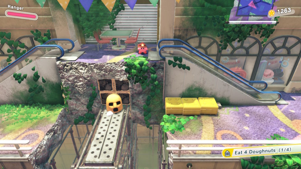 - Doughnut #1: Continue into the level until you reach a small jump with two escalators in the background. Clear the boxes on the upper level and collect the doughnut on the dining table to begin this mission.