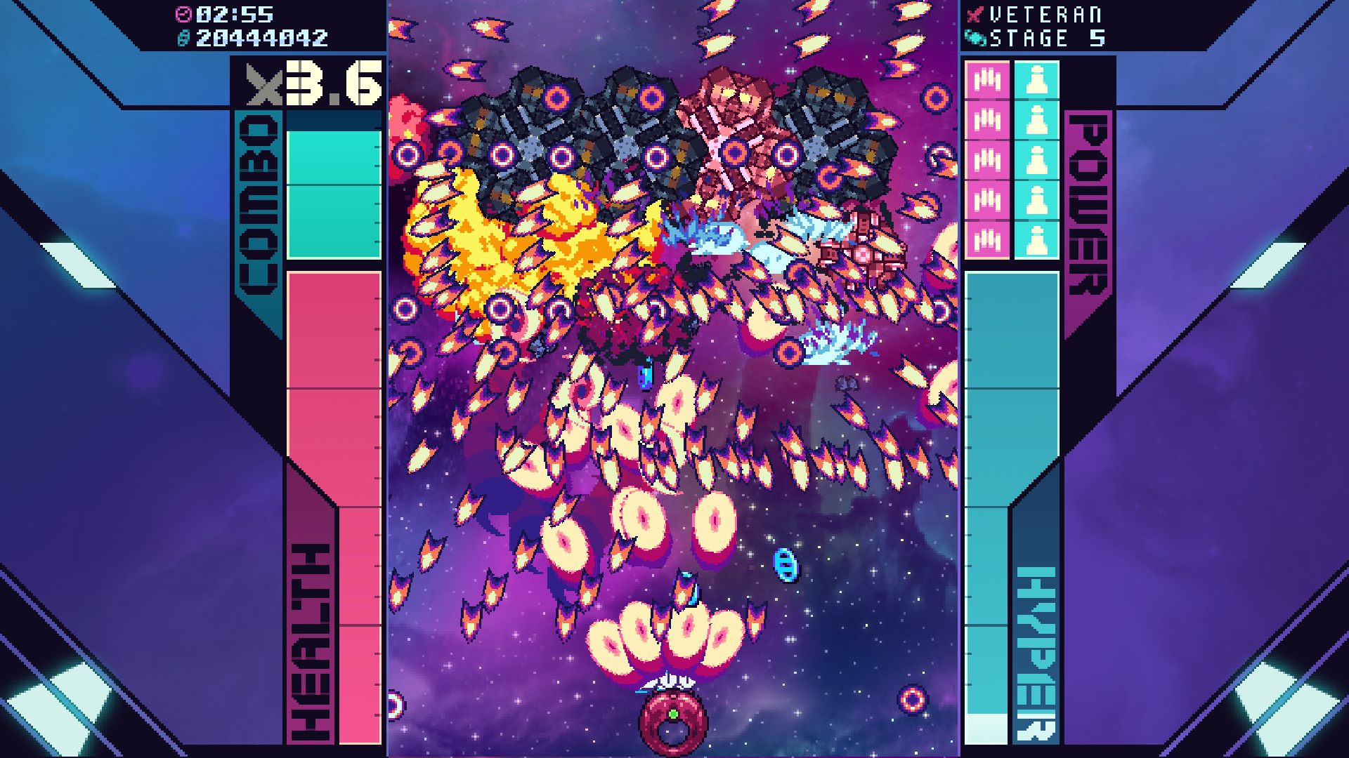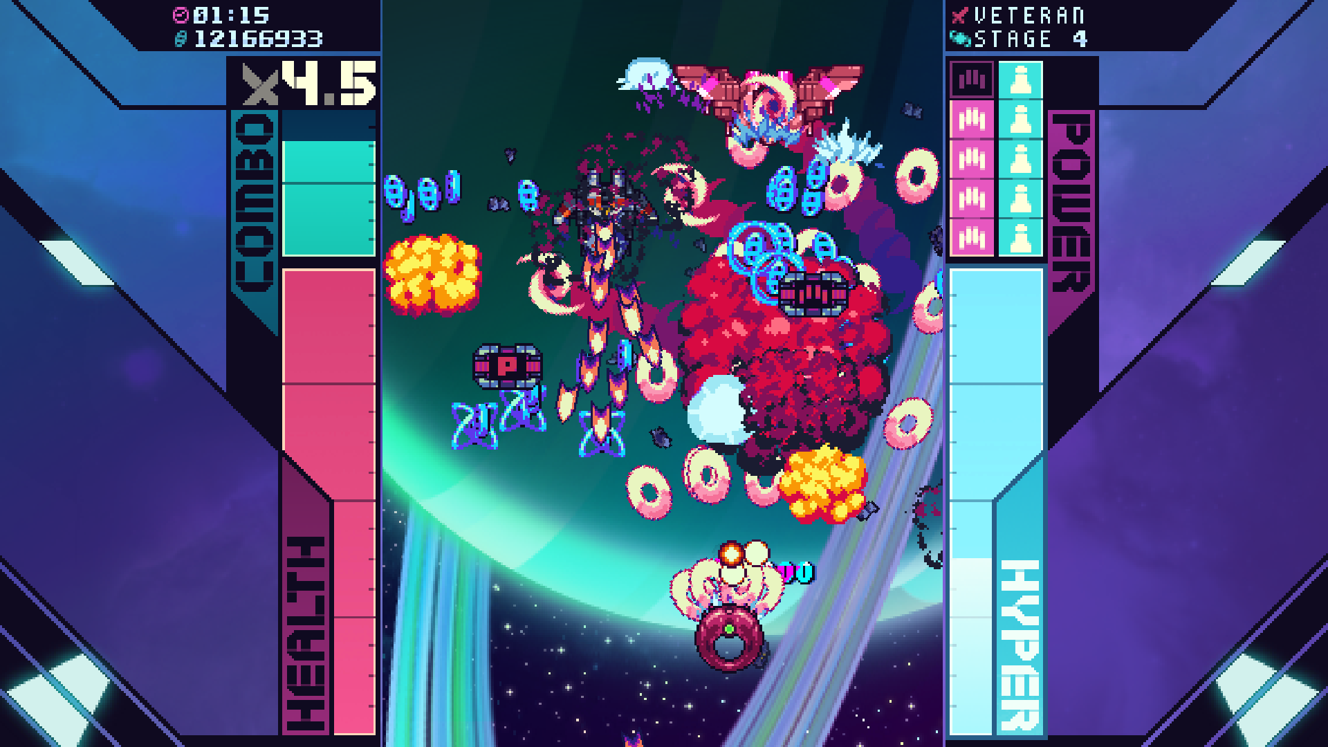 A simplistic design further lessens the burden for entry. Like most schmups, you control a single spacecraft as wave after wave of enemy fighters fire thousands of bullets your way. Super Galaxy Squadron EX rejects fancy mechanics that attempt innovation or reinvigoration of the genre, instead limiting the game to two buttons outside of the arrow keys: Z to fire both primary and secondary weapons, and Space to fire off a Hyper attack. The resulting gameplay feels enjoyably straightforward as you dodge projectiles, hold down the Z button for continuous fire, collect weapon powerups, and fire off the periodic super move. It’s all so streamlined I didn’t understand that secondary weapons fired automatically with the primary weapons for an embarrassing amount of time in light of all the fun I was having.