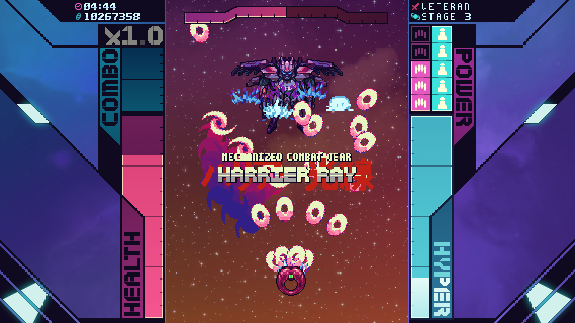 Fortunately, accessibility makes Super Galaxy Squadron EX, developed by Sysnet and an overhaul of last year’s well-received Super Galaxy Squadron, appealing. A plethora of difficulty options ensure newcomers won’t be overwhelmed, the pros have something tough to chew on, and those of you in between face a fair challenge. All three modes offer a large health pool, forgiving hit detection, and convenient checkpoints between levels and before boss battles. If all that sounds too easy for you, Hardcore mode switches off health drops and checkpoints, turning Super Galaxy Squadron EX back into one of those inaccessible schmups some people adore.