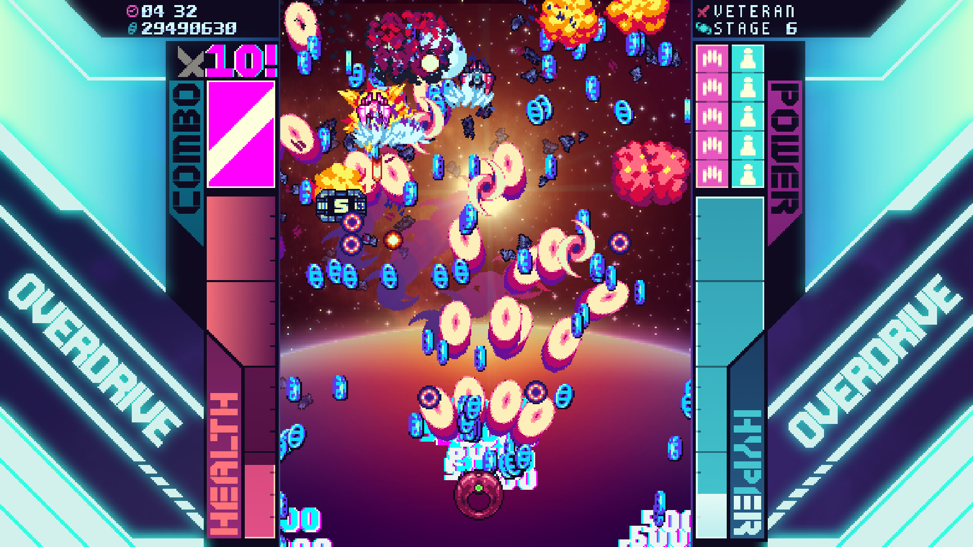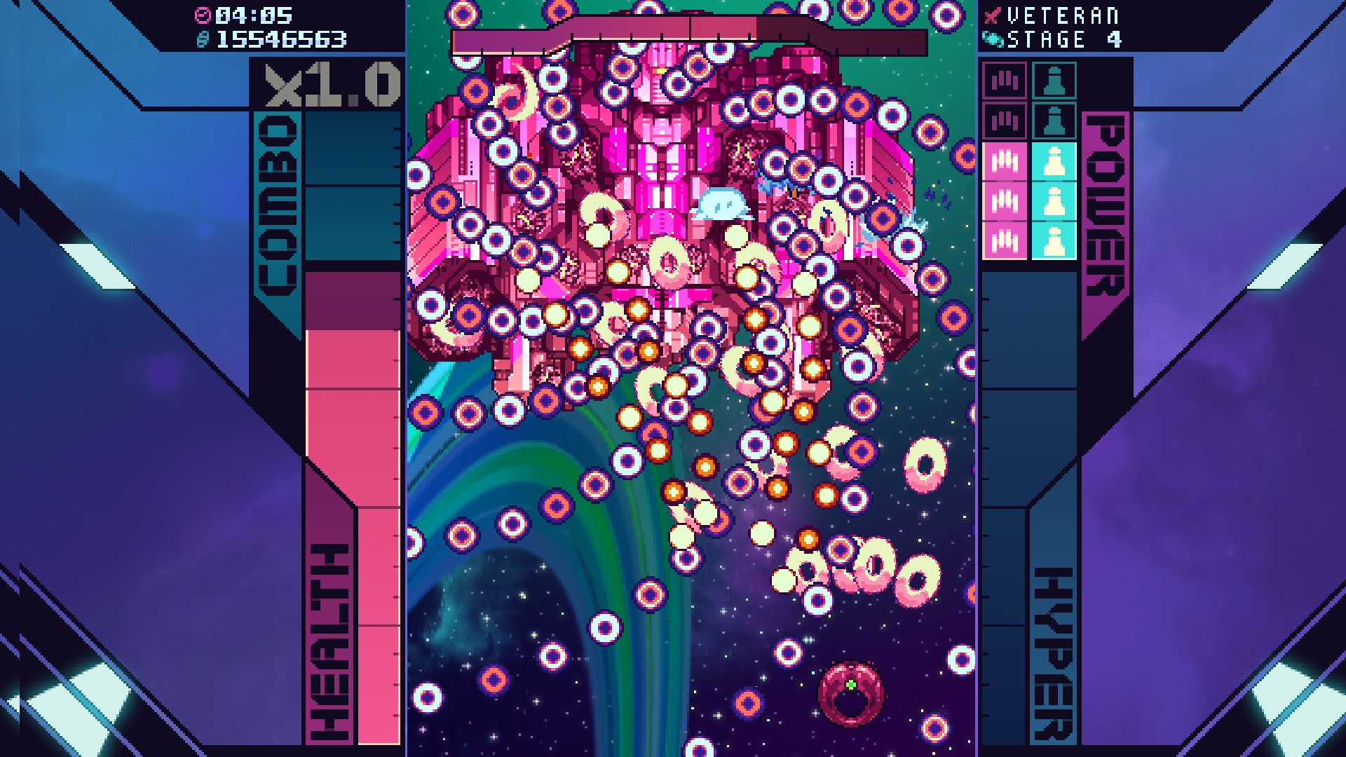 With such a simple approach, Sysnet walks a fine line between accessibility and a lack of longevity. As the Arcade campaign only features six levels, both beginners and veterans will clear it in a couple hours of frantic, intense schmup action. 14 different ships support many different play styles, but I quickly found the ship I enjoyed most–a sturdy, doughnut shaped vessel piloted by an alien of unknown origin, which fires off equally doughnut shaped projectiles–and stuck with it for most of my time with the game as I felt little need to replay with another craft.
