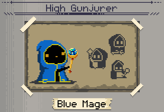 These wizards use magic spells to conjure rings of bullets to throw at you. Teleportation powers means they can travel around the room at will. The stronger variants of the Gunjurer have homing potential, making their bullets harder to dodge.