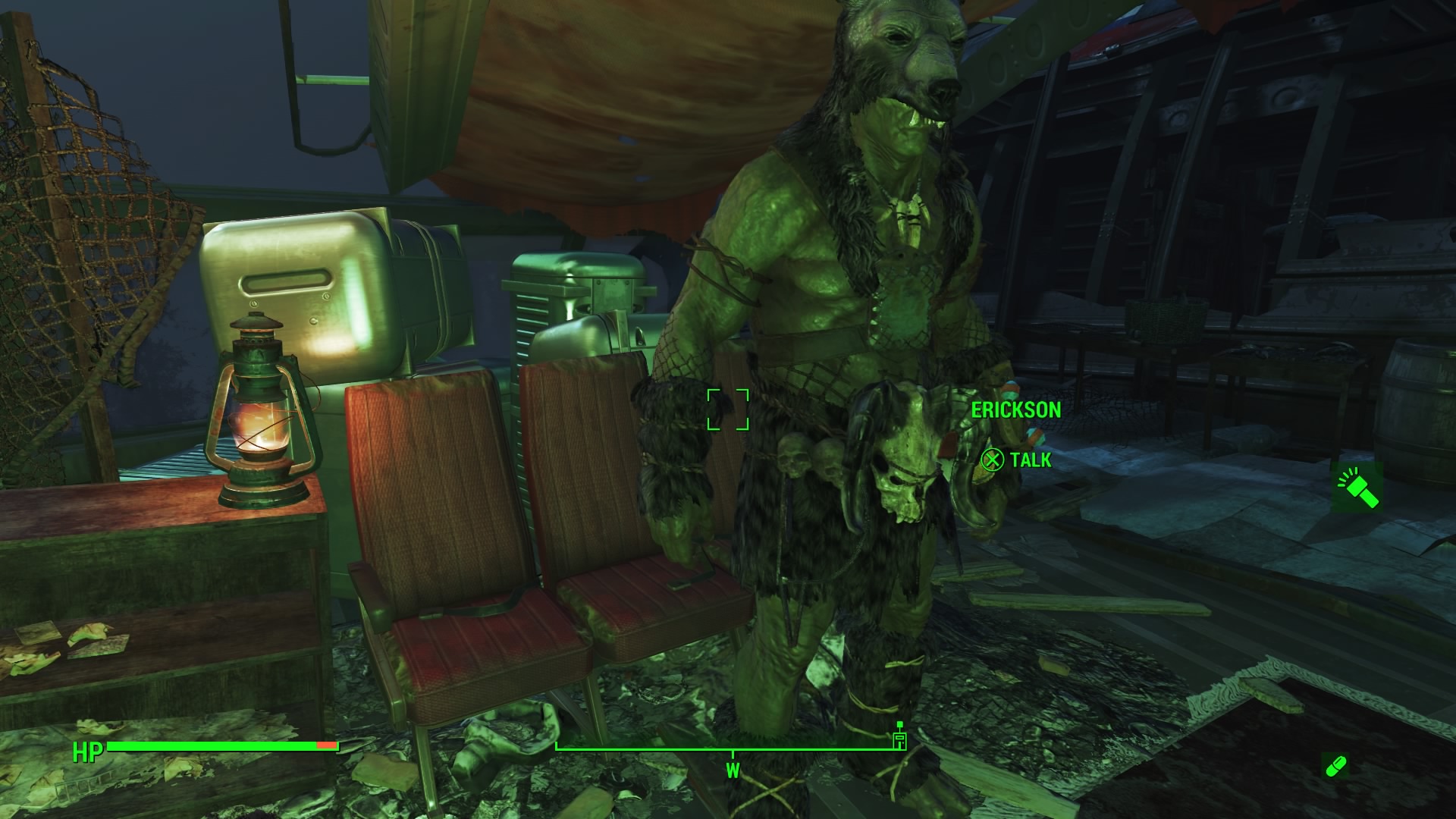 The site is occupied by a single Super Mutant trapper named Erickson. Talk to him and make peace, and he’ll offer to see his dogs for 250 caps each. If you choose to buy a dog, a selection menu will allow you to send the dog to guard your preferred settlement location.