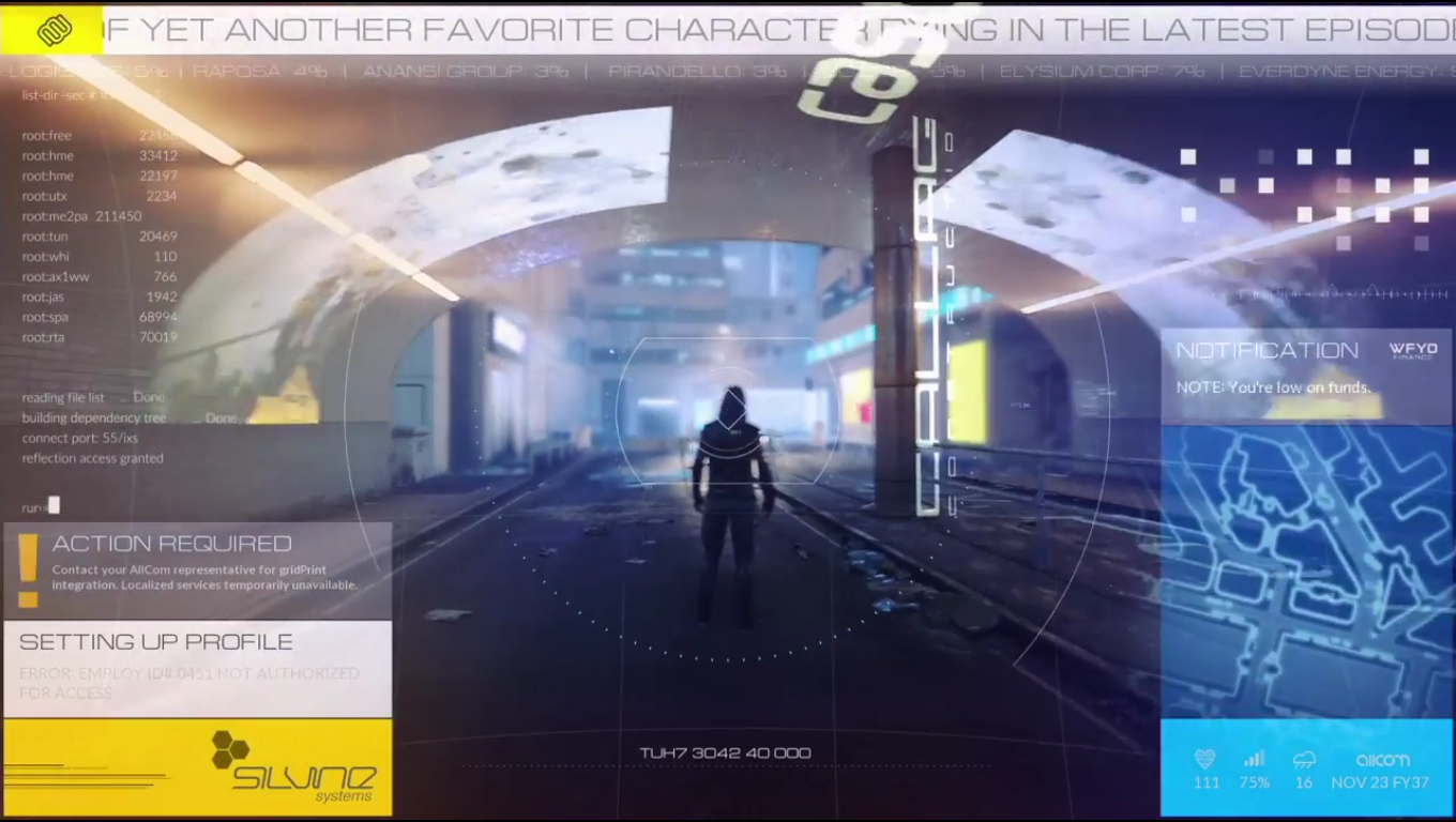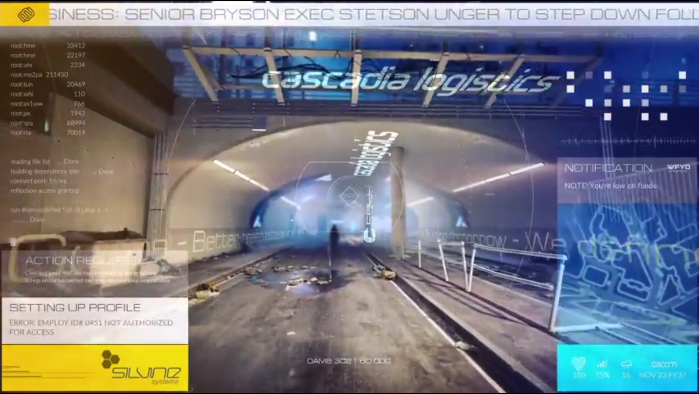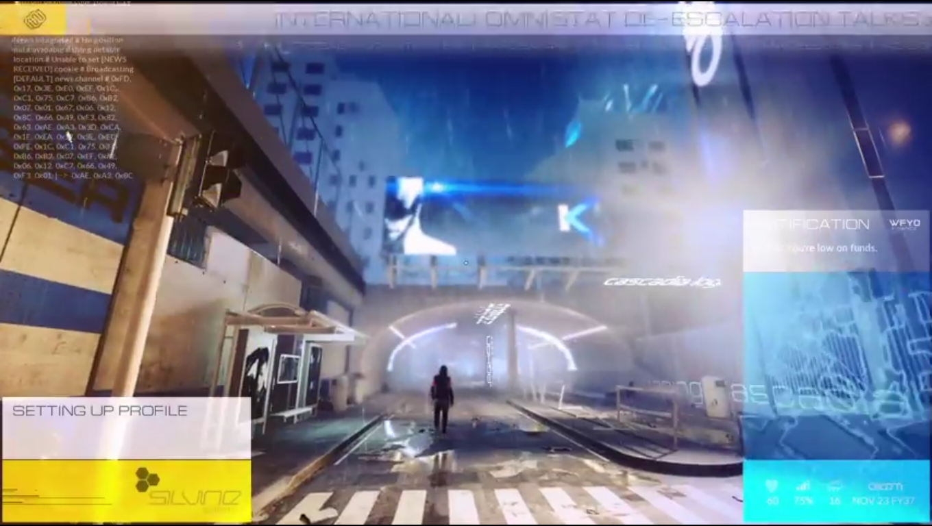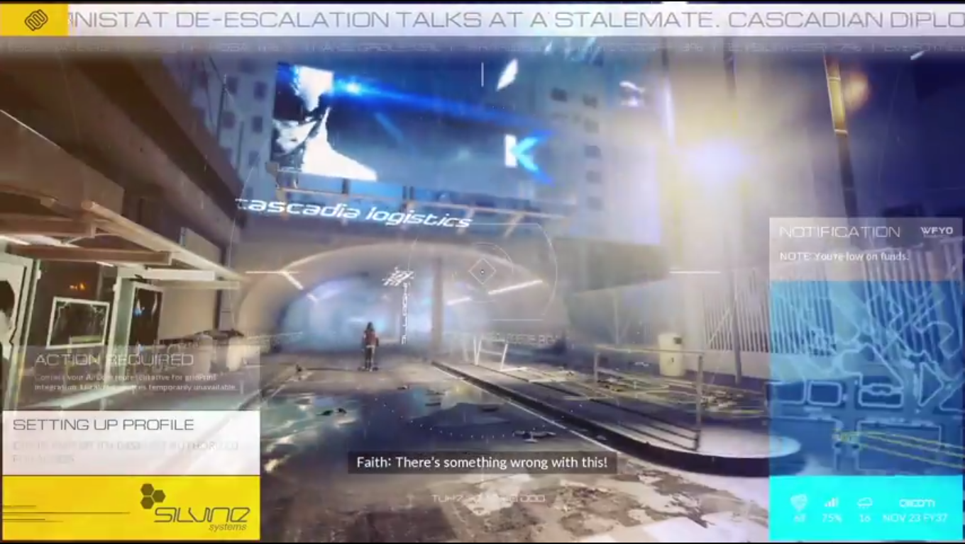 Early in the campaign, Faith gains a ‘Beatlink’ — a contact lens that displays all kinds of useful information and serves as the HUD as you run and jump across the city of Glass. To everyone that isn’t a courier, the Beatlink looks like an ad-encrusted nightmare device, displaying advertisements on every uncovered surface.