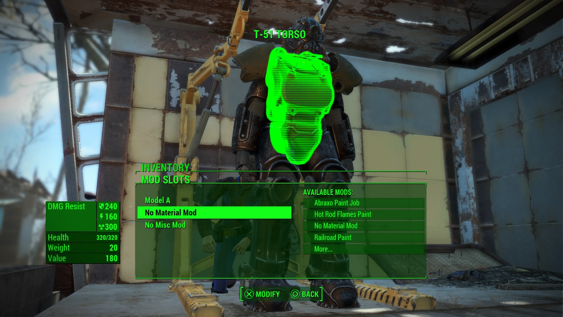 - In the Power Armor mod screen, select each piece of T-51 armor, then select the second mod slot. This is the ‘Material Mod’ slot in the menu.