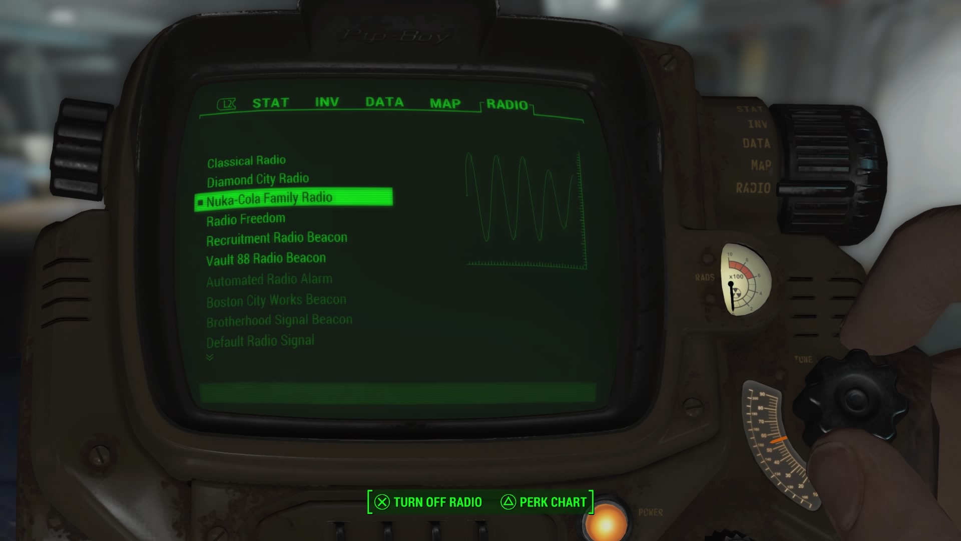 - Open your Pip-Boy and access the Radio tab. Select “Nuka-Cola Family Radio” to start the the quest All Aboard!
