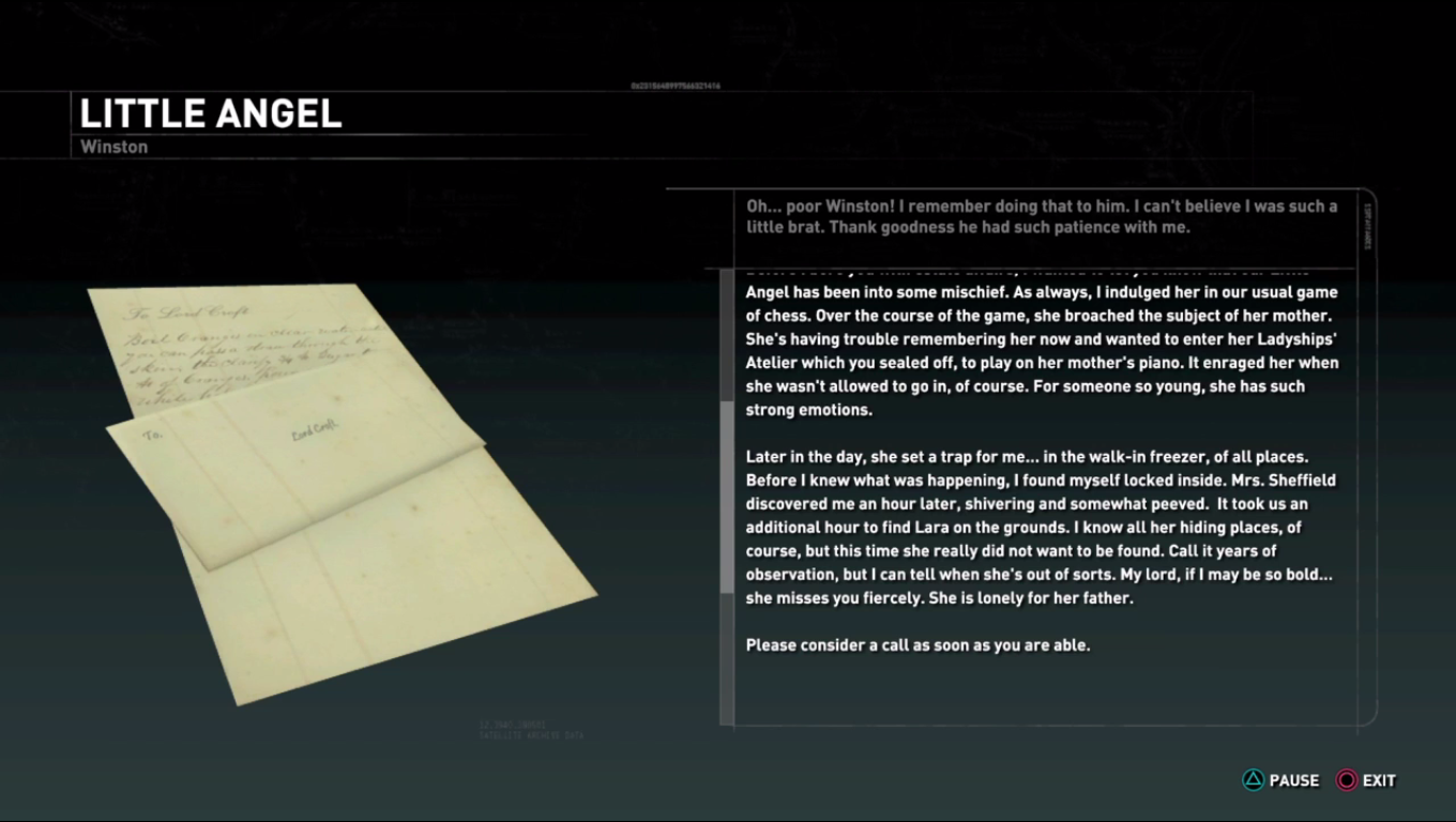 This callback comes from Tomb Raider: Underworld, the last in the “Legends” continuity of adventure games. Winston isn’t the only one leaving documents around, you can also find letters and notes related to Amelia’s death. Amelia, or Lady Croft, died in a plane crash in the Himalayas of Nepal.