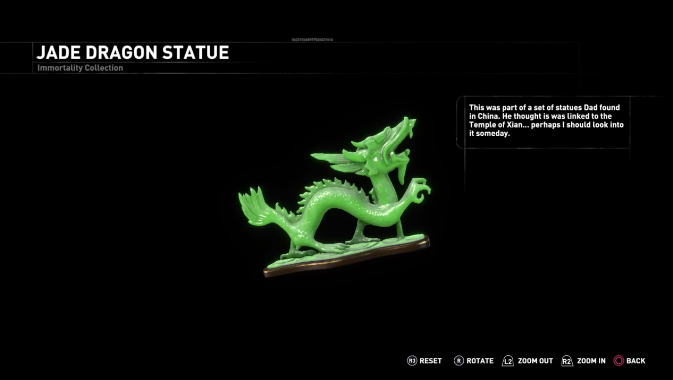 Referencing the final goal of Tomb Raider 2, the Temple of Xian Jade Dragon artifact can be examined, with Lara coyly suggesting that she might need to look into that legend one day.