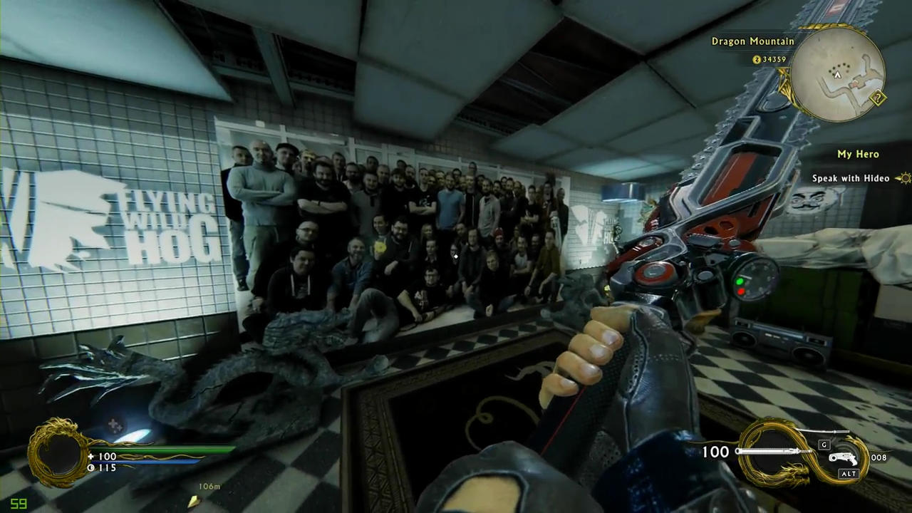 The locked door? You can walk straight through it. On the other side, you’ll find stairs leading down into the hidden developer room — an old-school style Easter egg with a massive picture of the development team that made Shadow Warrior 2.