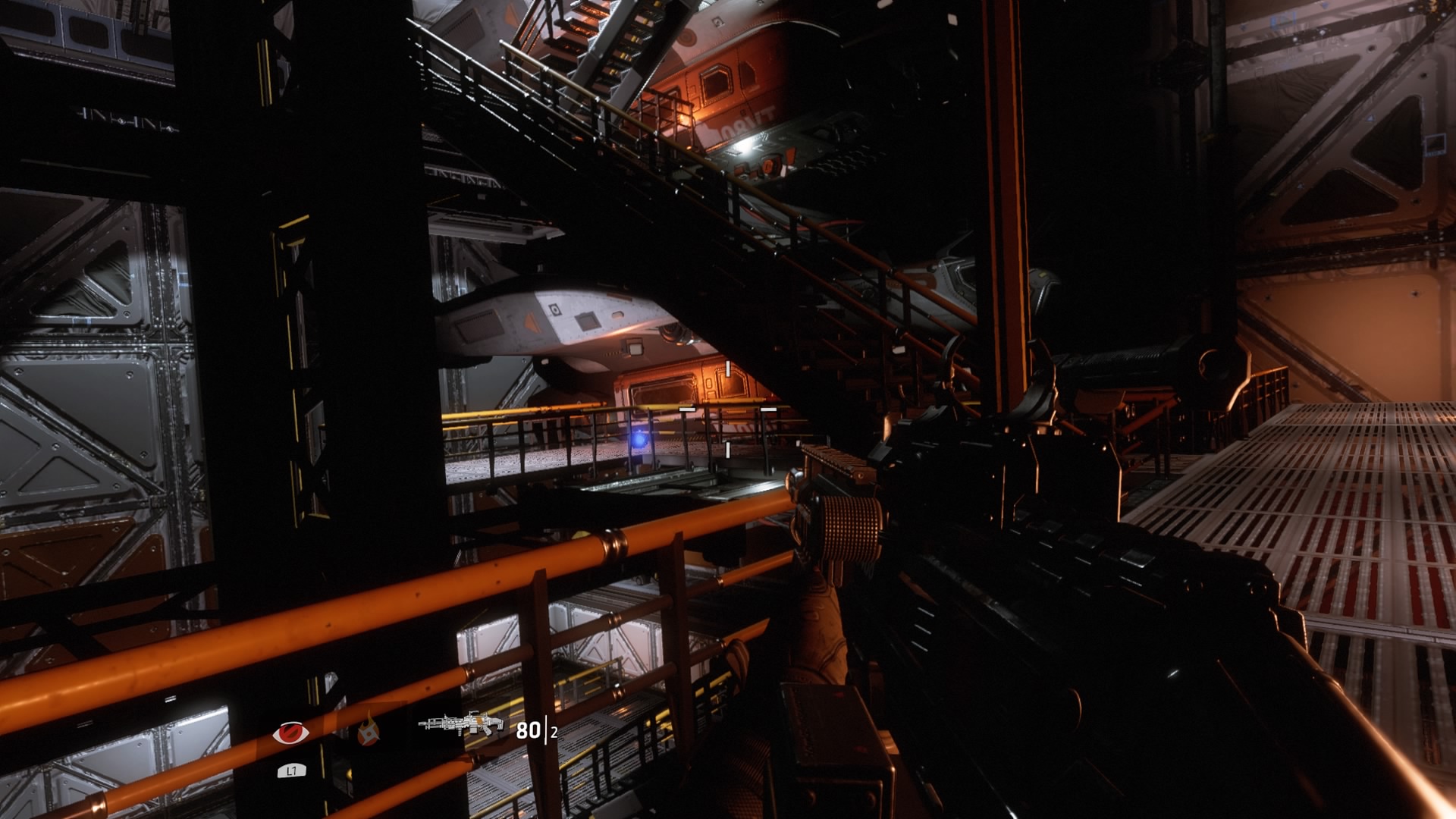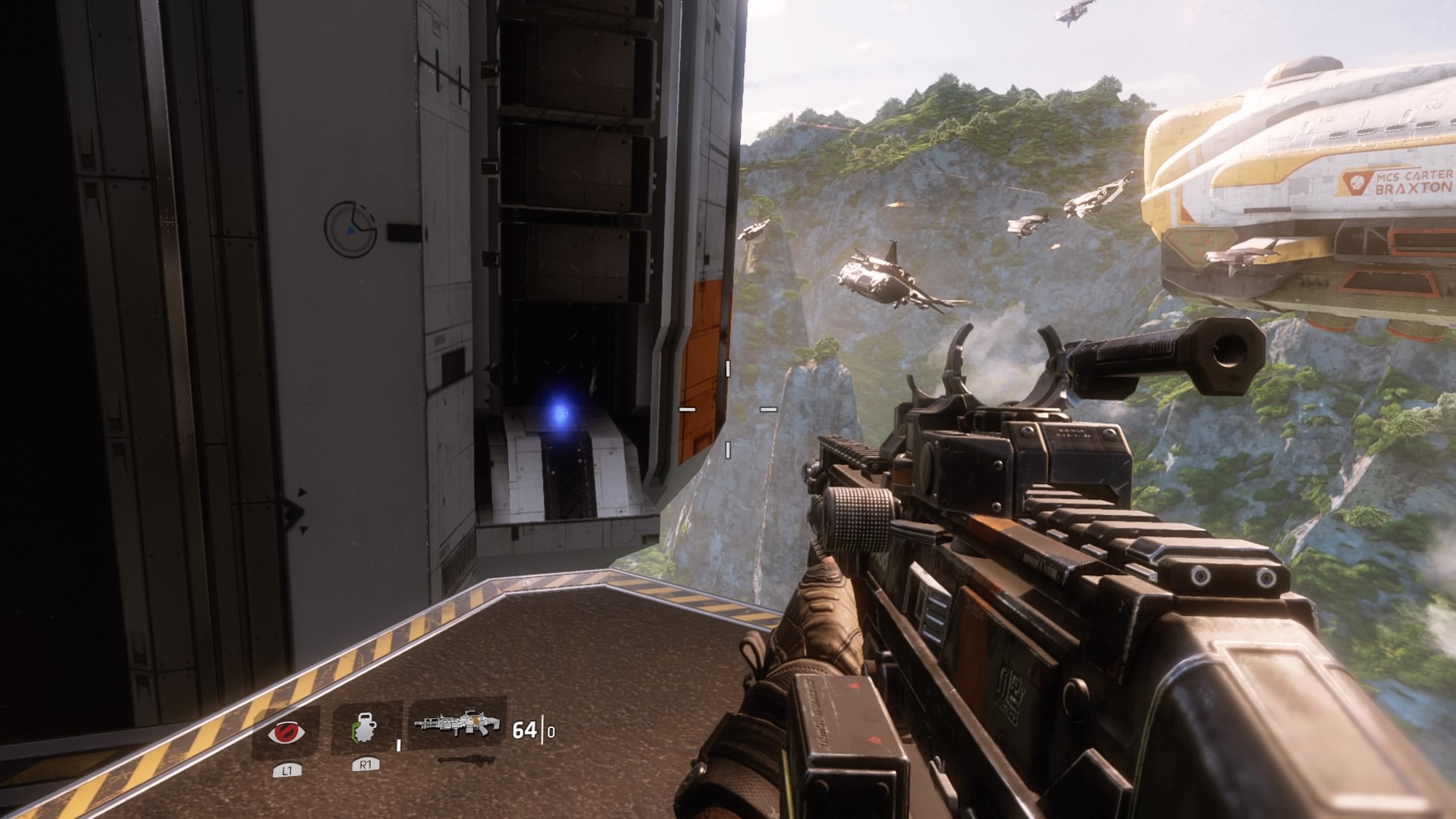 - Pilot Helmet #41: Jumping onto the landing ship hangar bay, you’ll be able to see the blue light of the pilot helmet from the exterior. Once you enter the enemy ship, fight to the diagonal window in the back-right of the room. There’s a small spot where you can wall-run and jump to get the helmet.