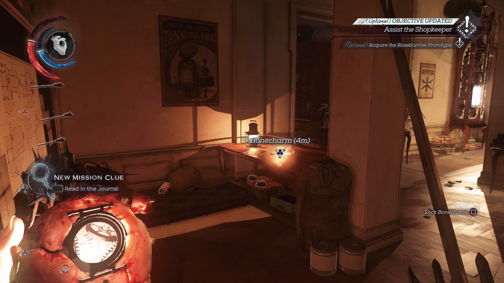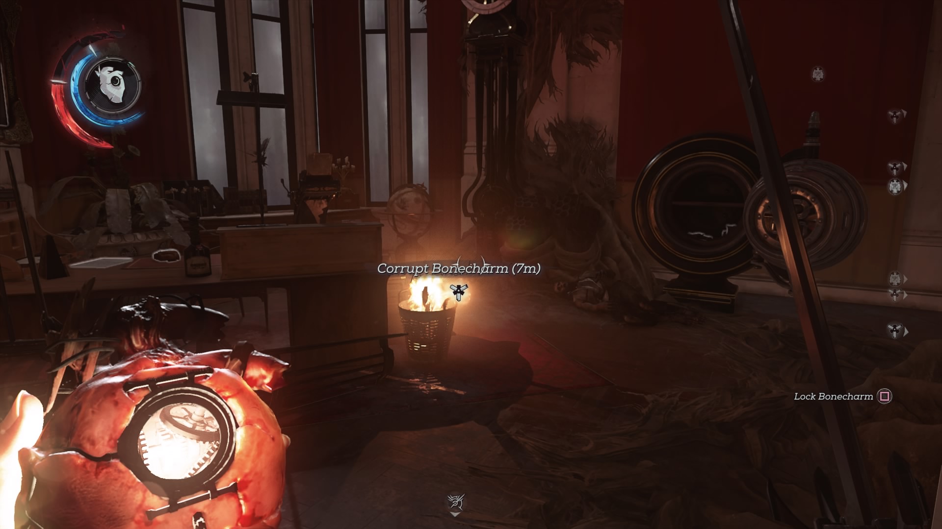 - Bonecharm #2: To the right (and across the street) of the Conservatory, there’s a building guarded by an alarm and several soldiers. Enter the building through the upper floor windows or the first floor door. The charm is on the desk of the workshop apartment.