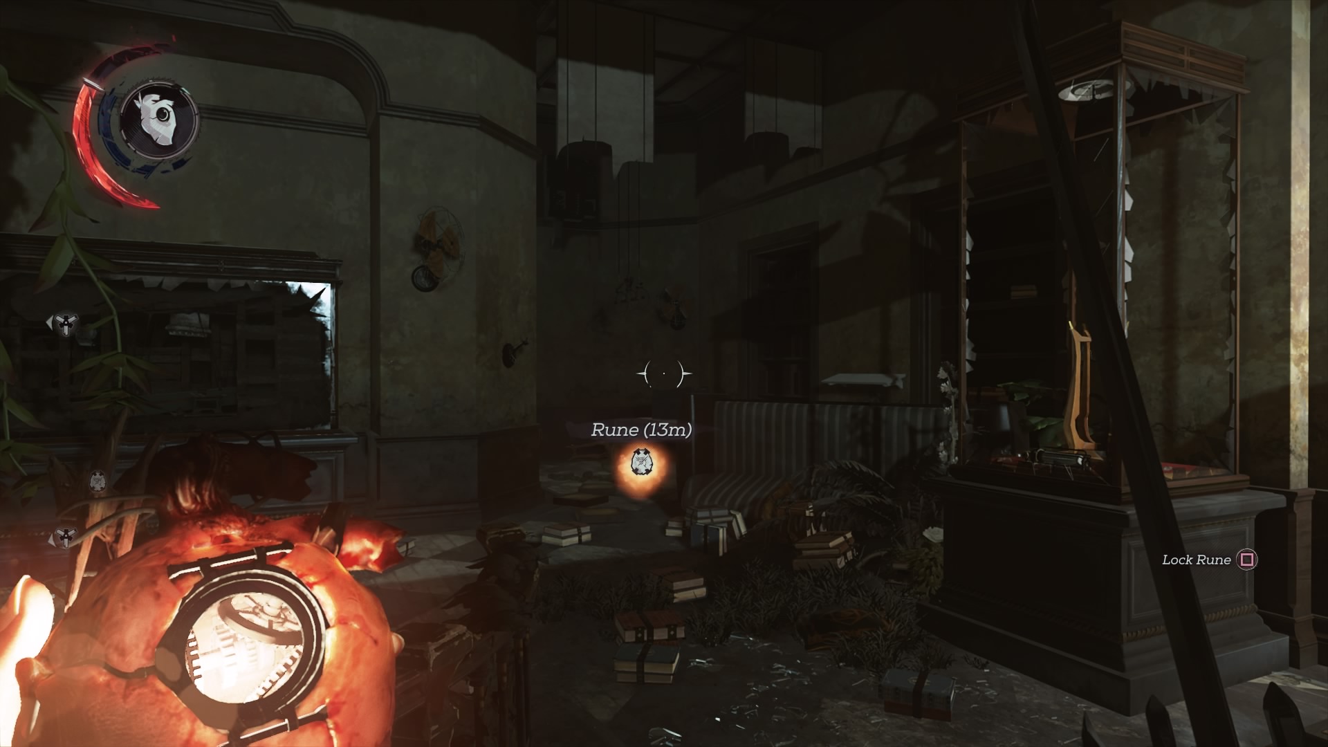 - Rune #1: At the start of the mission, take the central stair up to the second floor. Enter the ruined display room with the circular hole in the center. The first rune is in the corner.