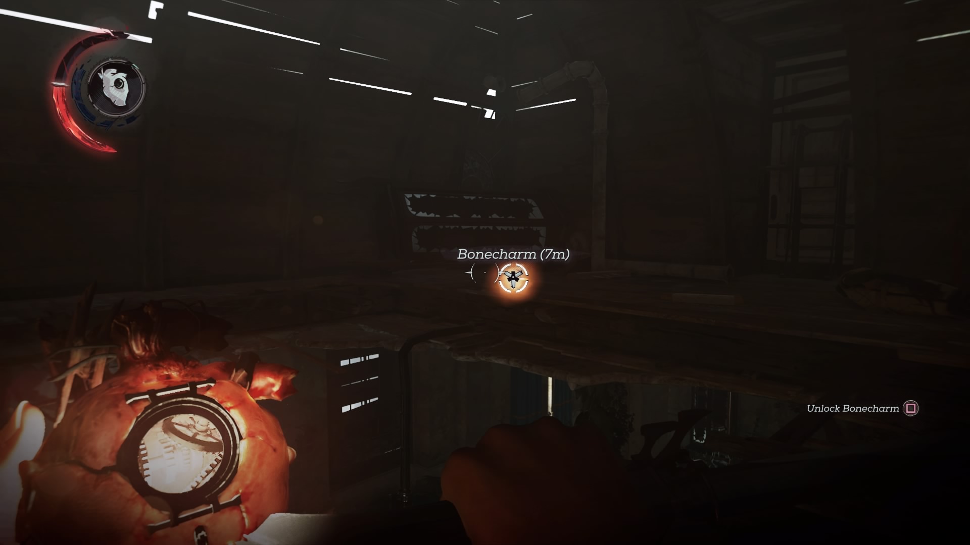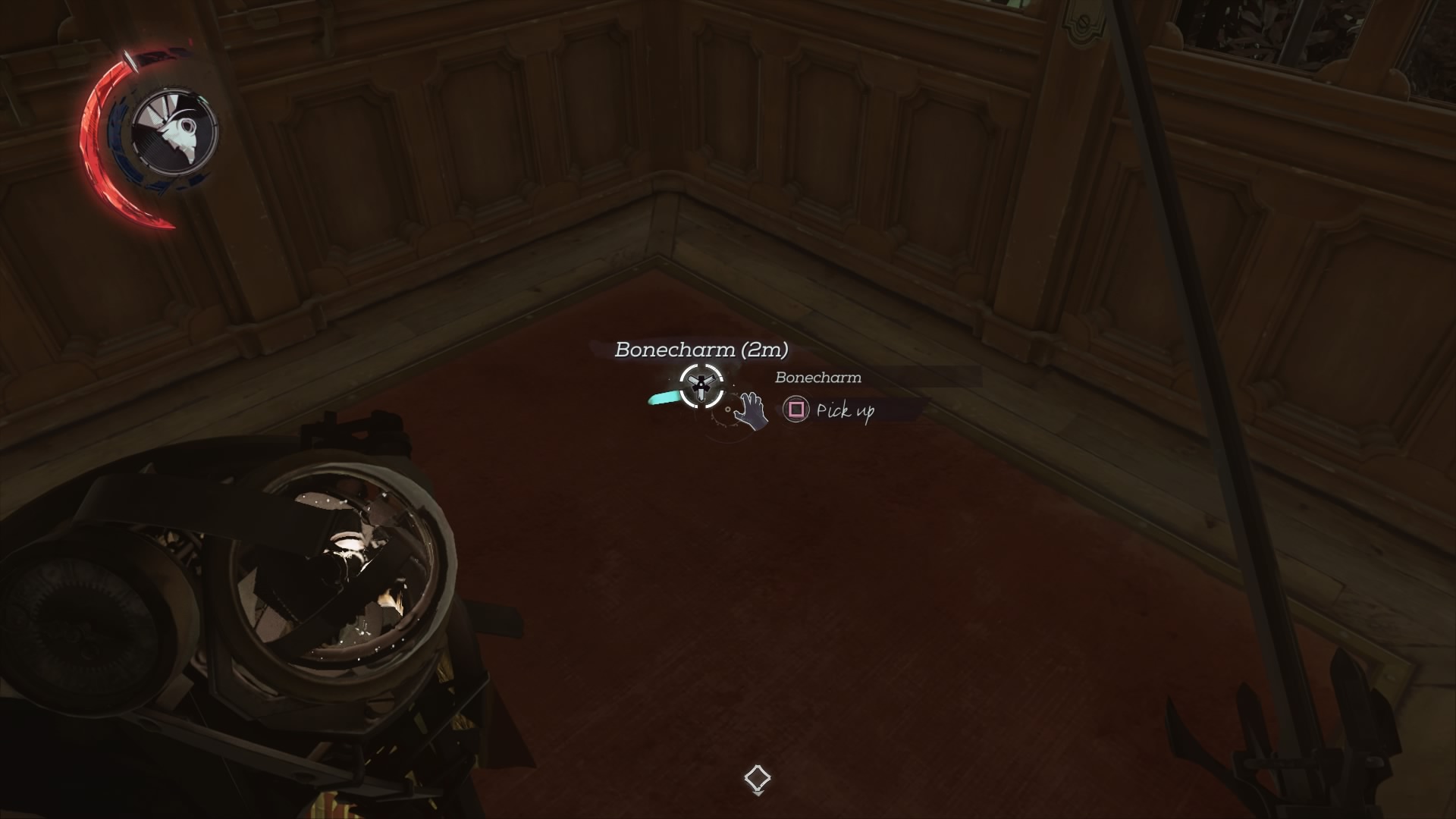 - Bonecharm #2: Reach the second floor balcony above the dining room. Against the wall, there are three switches (past only) that control the three chandeliers in the room.