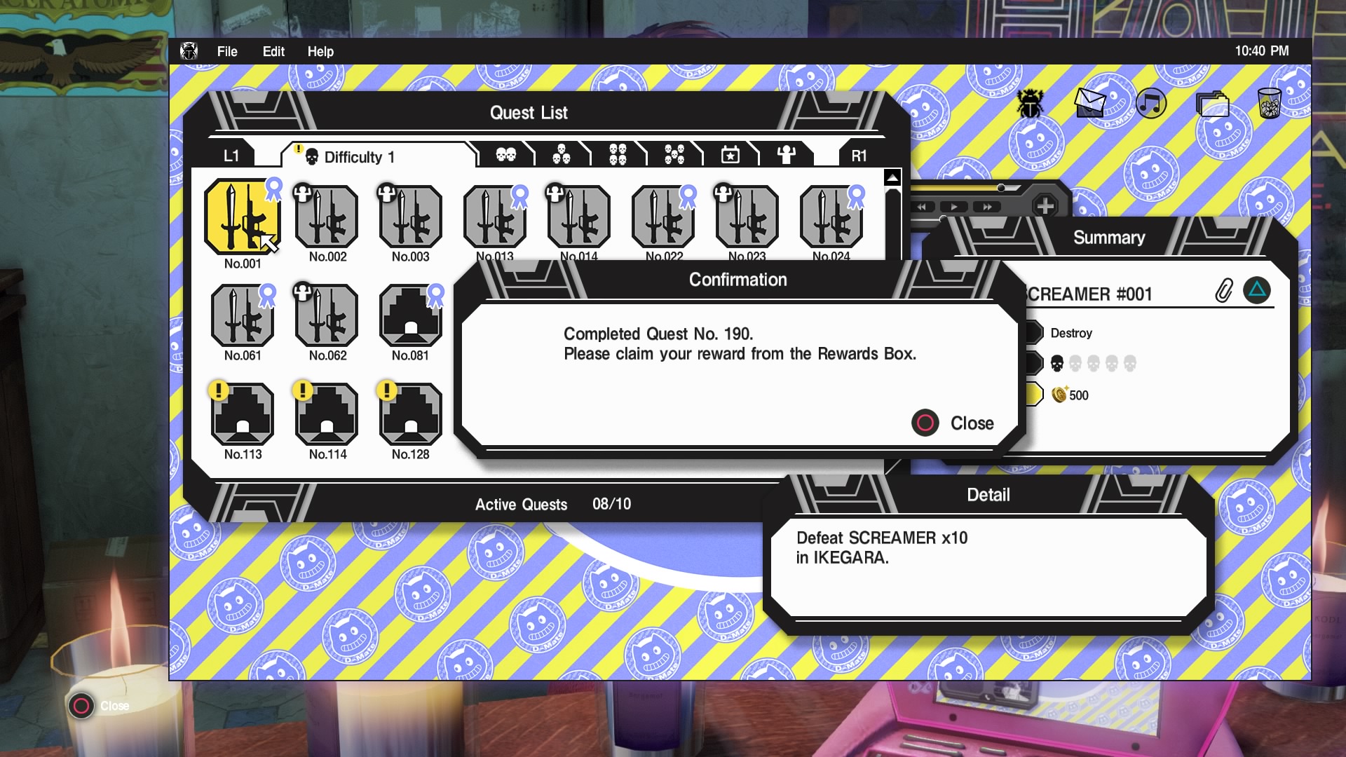 From the Fountain in the Waiting Room, you can access the Arcade. This strange area offers hints, backstory entries, and the quest menu. Quests will unlock as you reach new floors in the Tower of Barbs and you can accept up to 10 quests at any given time.
