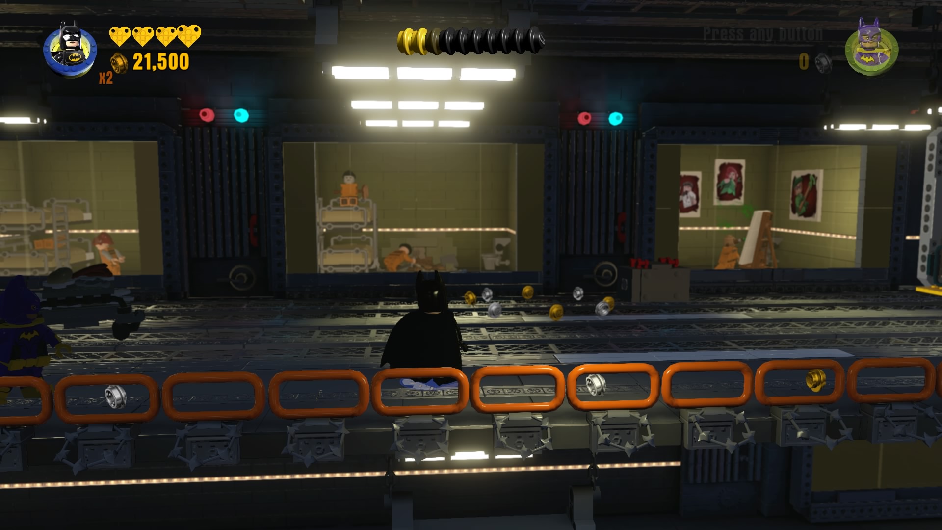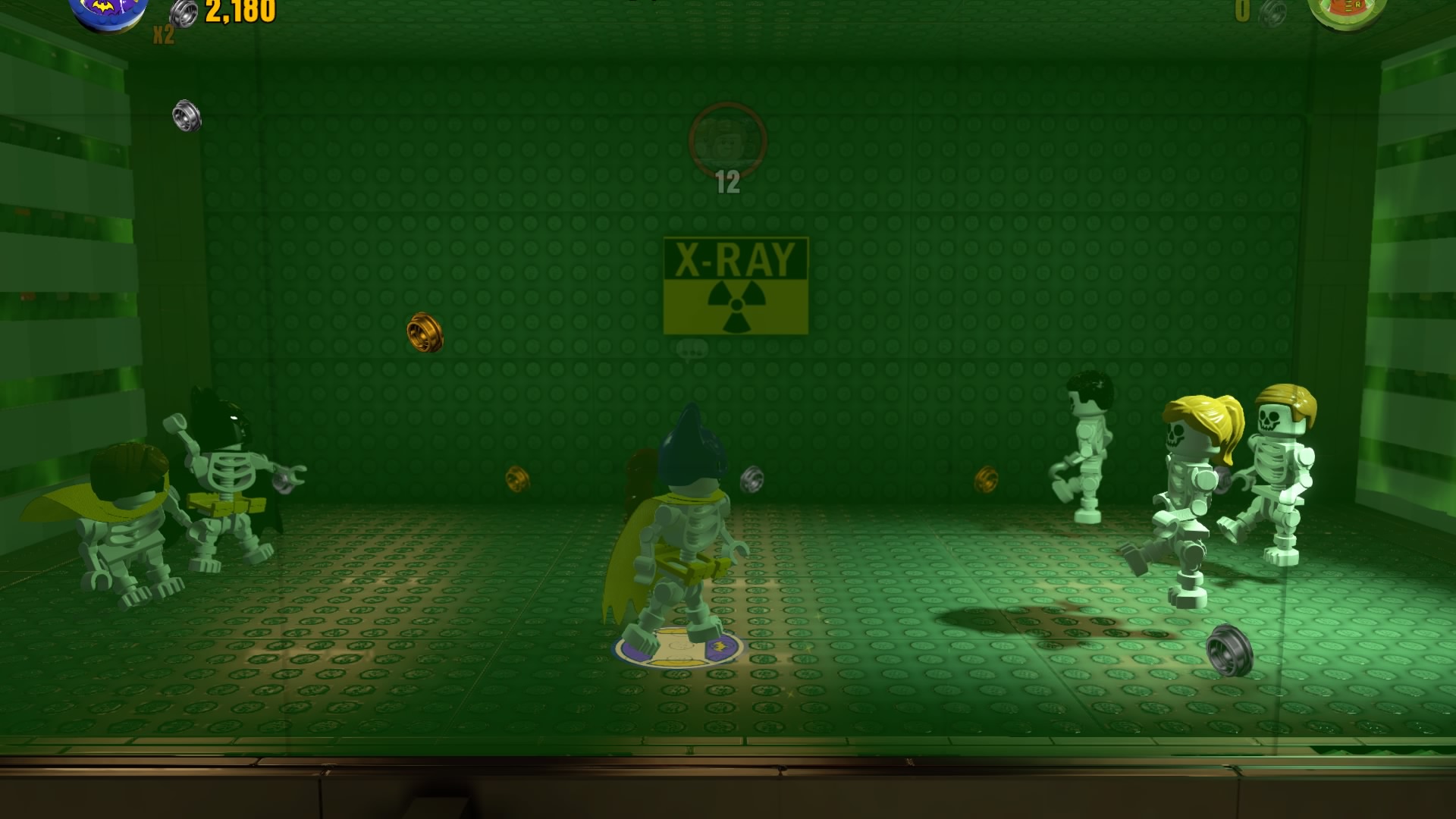 Batman and Robin aren’t welcome in the Asylum today, and right off the bat (pun not intended) our heroes are trapped in an X-Ray chamber. Defeat 12 guards to enter the vault chamber. You’ll need to complete two steps to get that big vault open, so let’s get cracking.