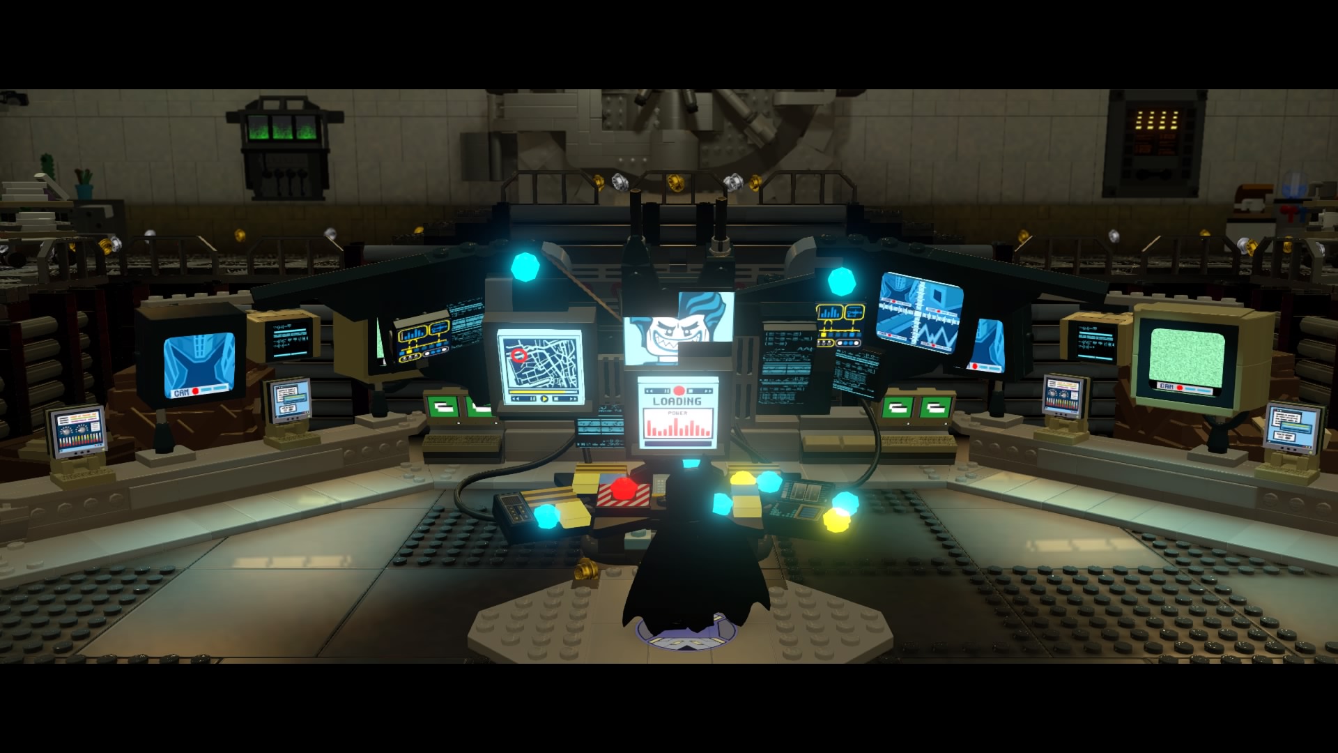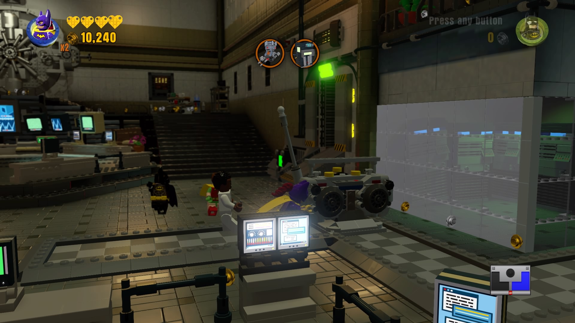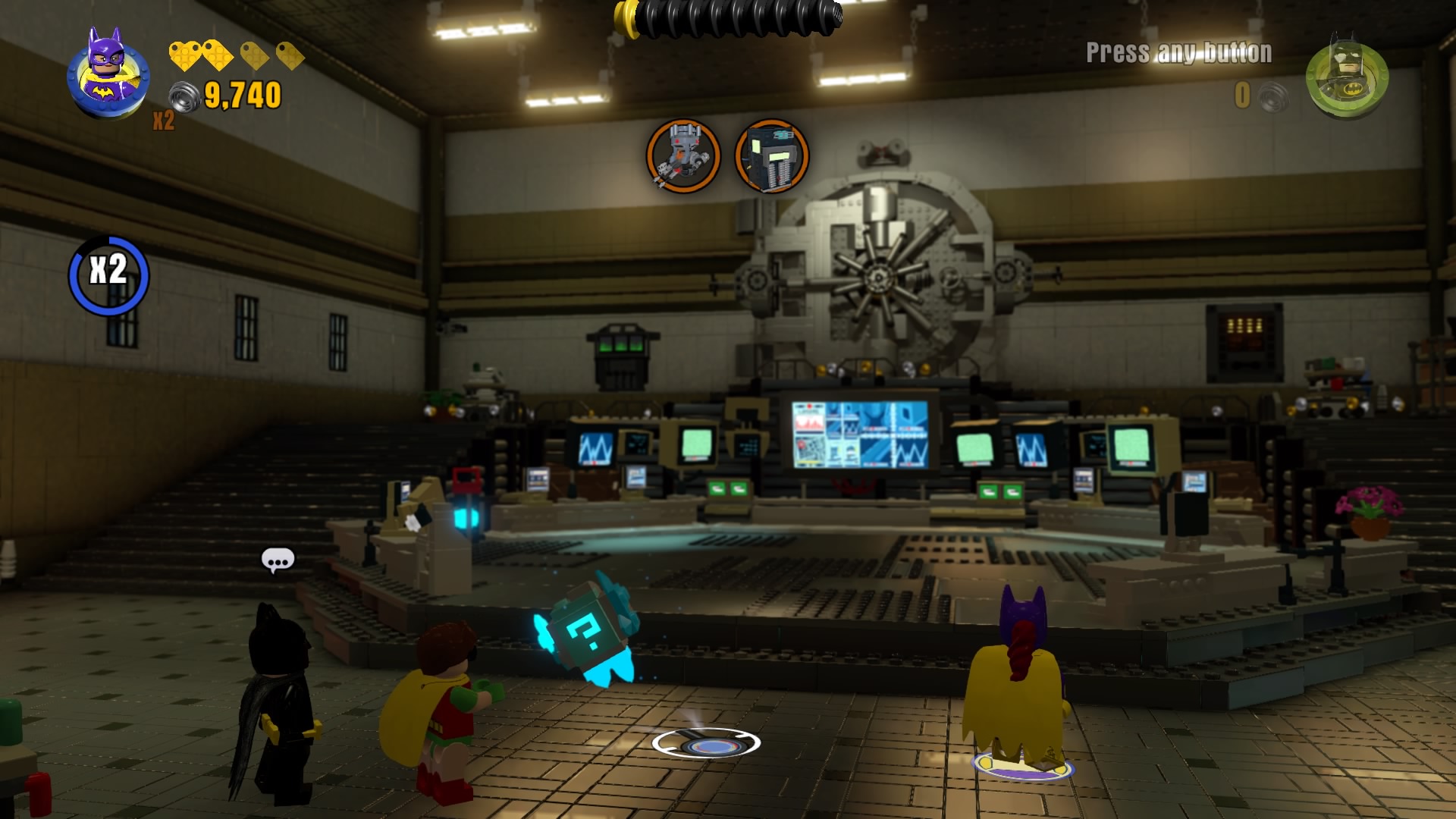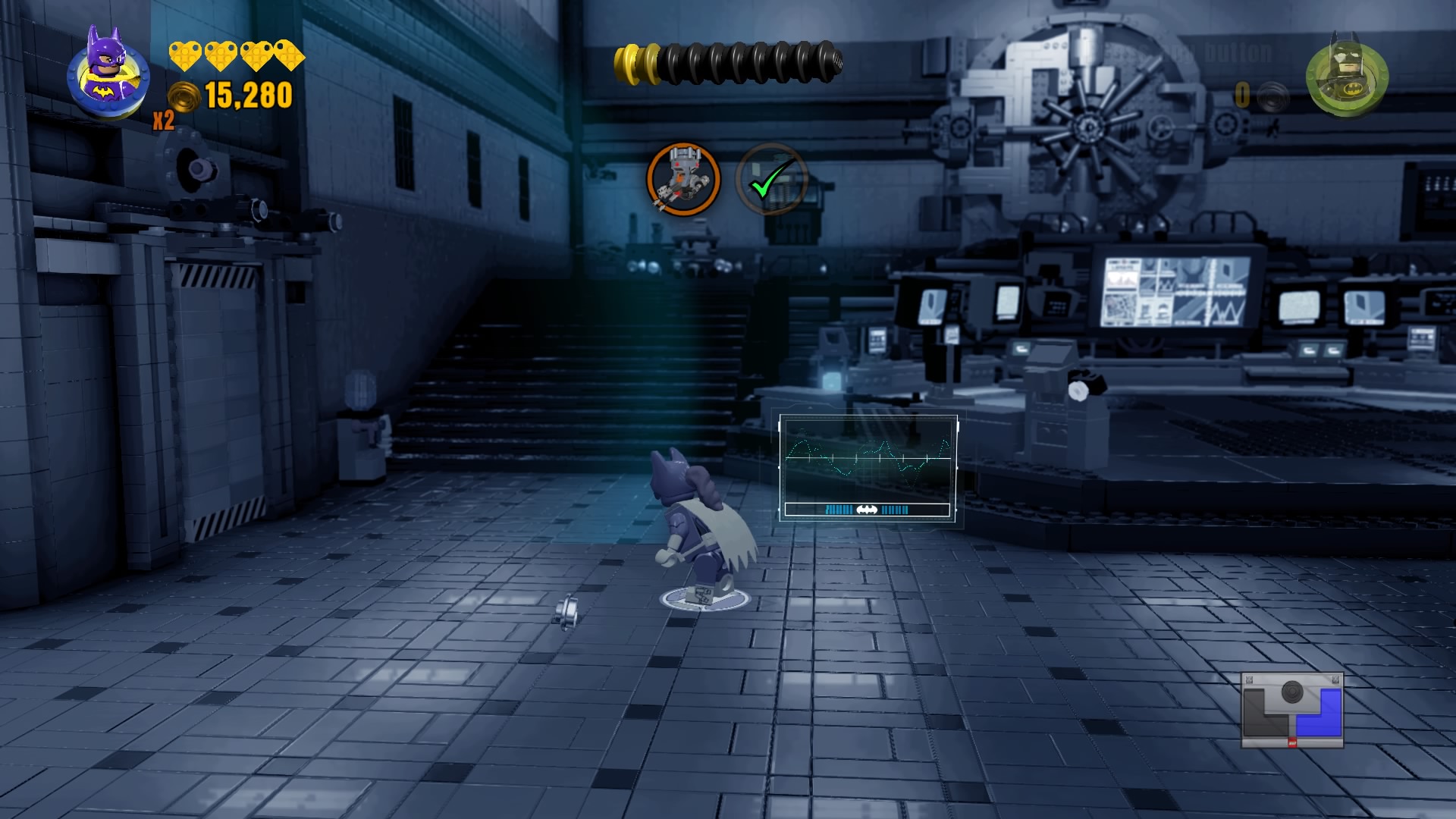 Now that the Master Builder icon is here, use Batman to combine everything into a mini Batcomputer. Flip the switch to open the vault into the bad guy cells.