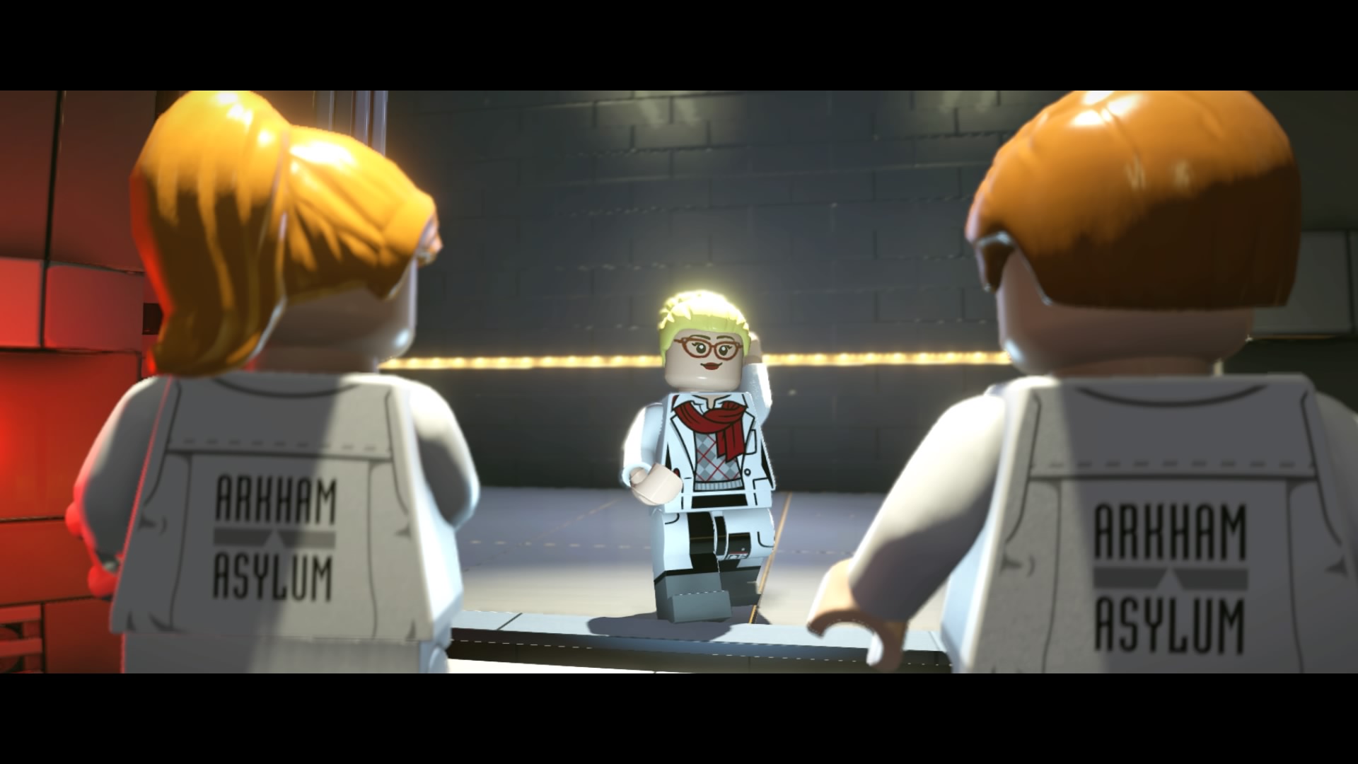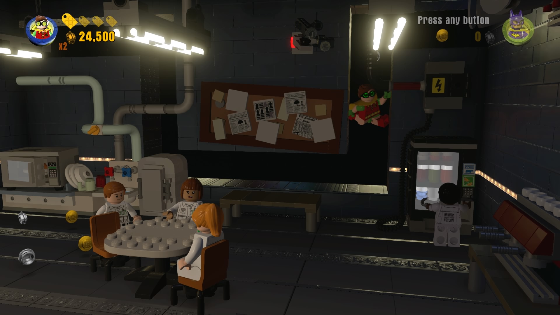 Squeeze into the break room and flip the switch to open the gate so Batman get stealth his way past the security cameras ahead. Deactivate the camera with a switch, then repair the lift panel with smarty Robin. Push the turnstyle to lower the stairs down. We’re almost at Joker’s cell now!