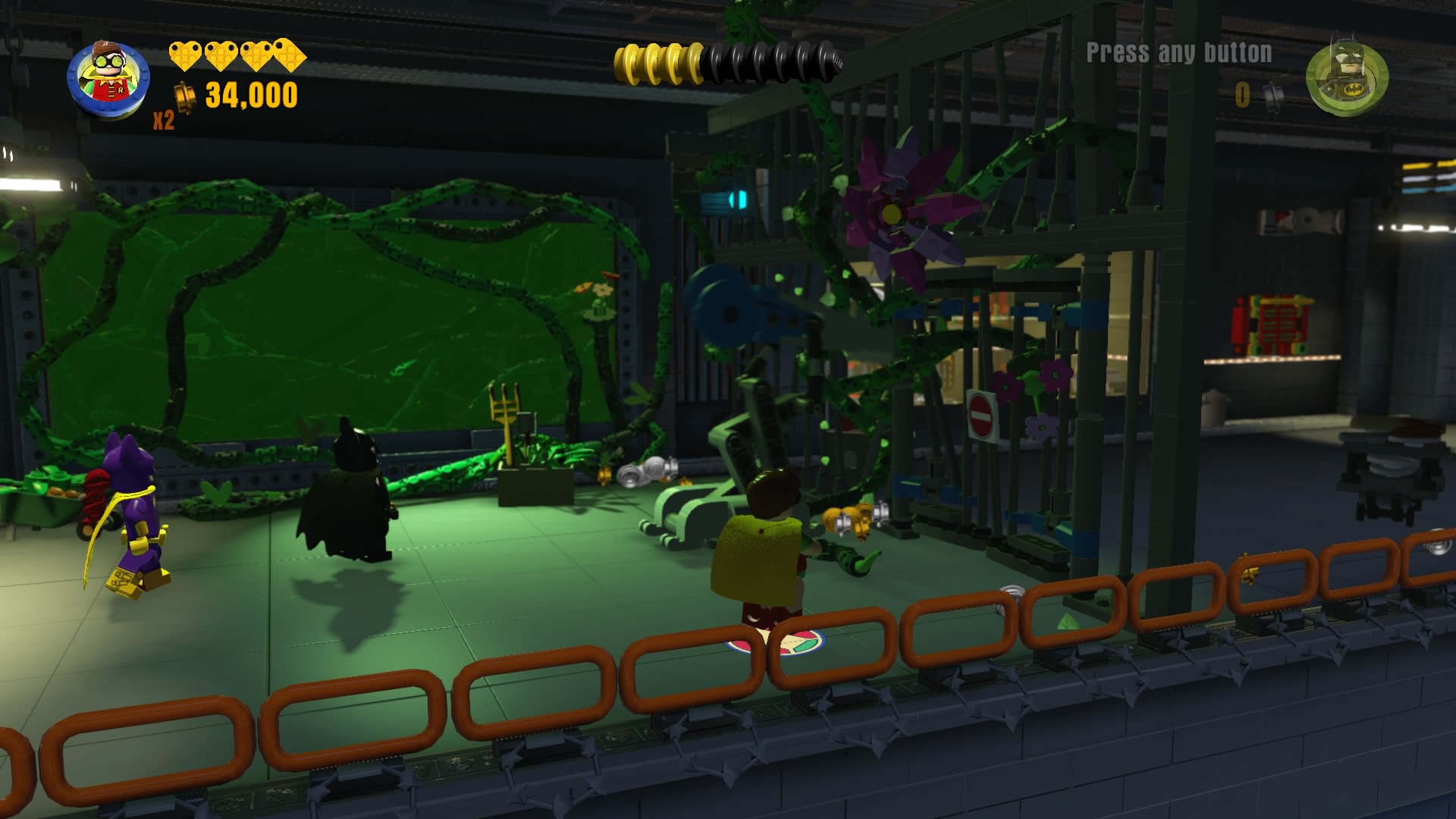 Downstairs, the gate will lock near Poison Ivy’s planty cell. Smash the glowing pot, then build the two sets of hopping bricks that appear to cut through the vines (and gate!) to clear the path forward.