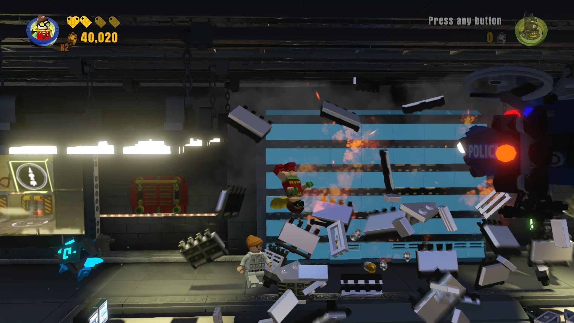 Ahead, run though the metal detector to alert a police drone — don’t fight it! Instead, let it destroy the gold LEGO shutters. When they’re busted, Robin will find a new Robin Chute to crawl into.