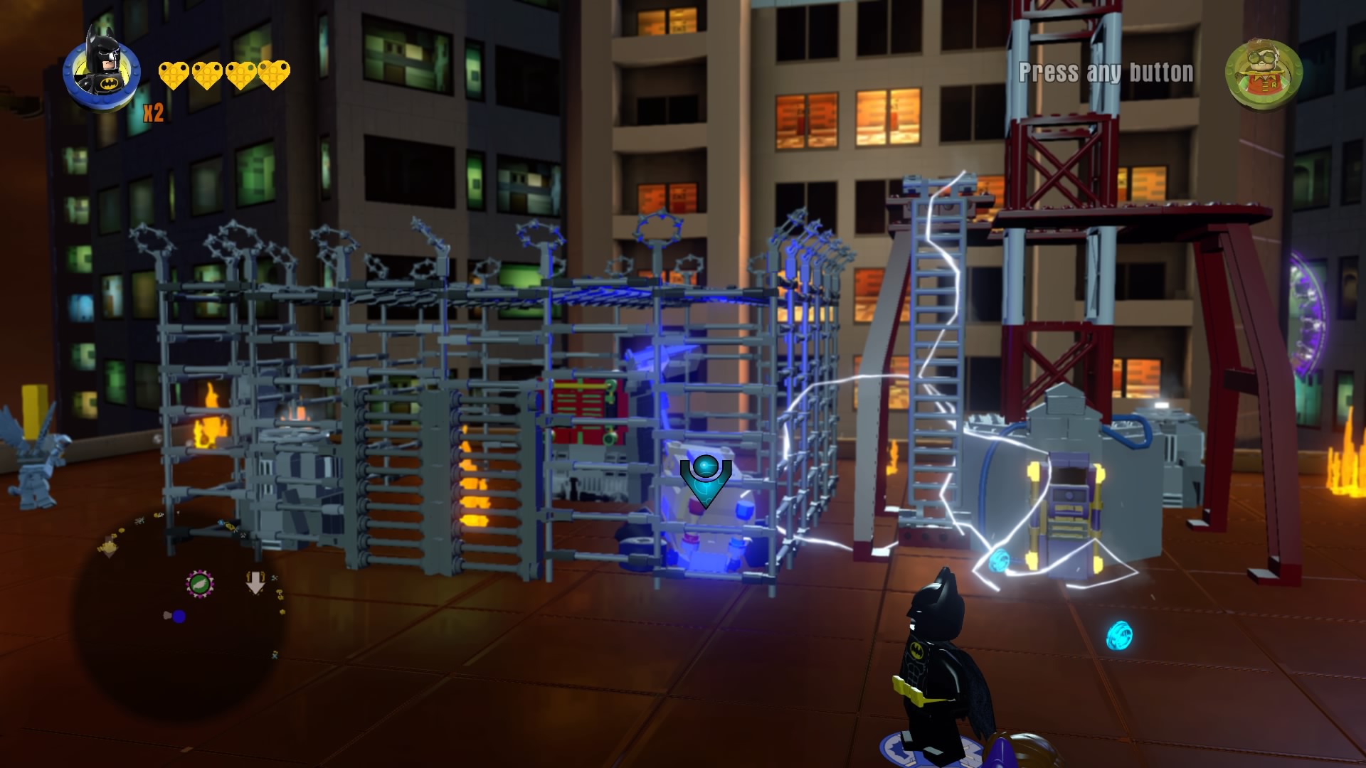 As always, there’s a short interlude before diving into the next stage. Batgirl (Barbara Gordon) needs to access the electrified antennae. Jump into the Robin Chute in the back-right corner of the rooftop and repair the generator.