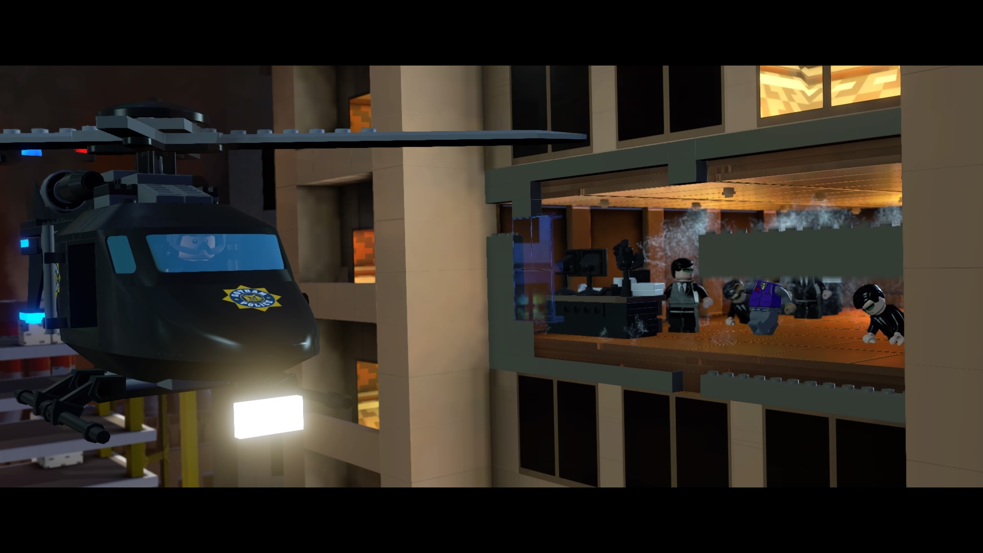 Swap to Batgirl and complete the puzzle — all you need to do is match the lines of each circle. After a Matrix reference, climb up into the wrecked office (filled with Agent Smith clones) from the fallen tower.