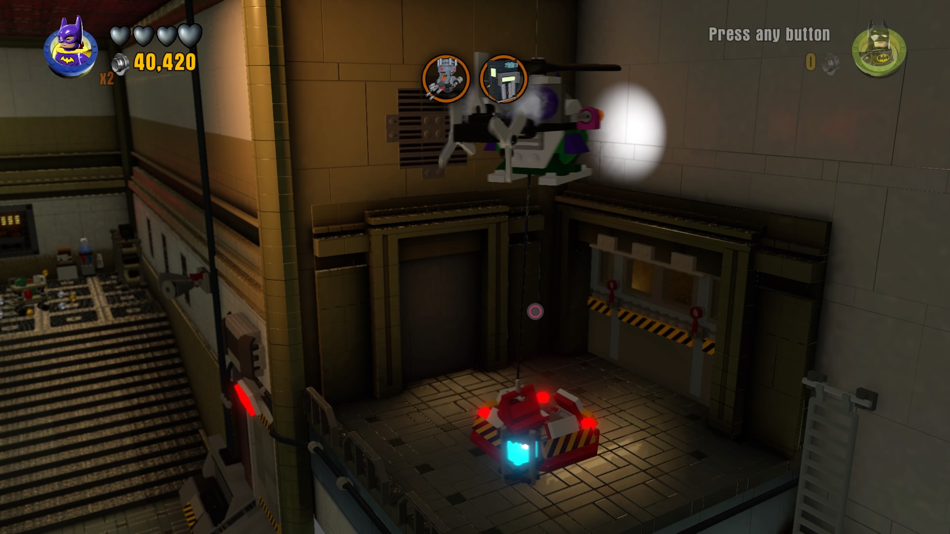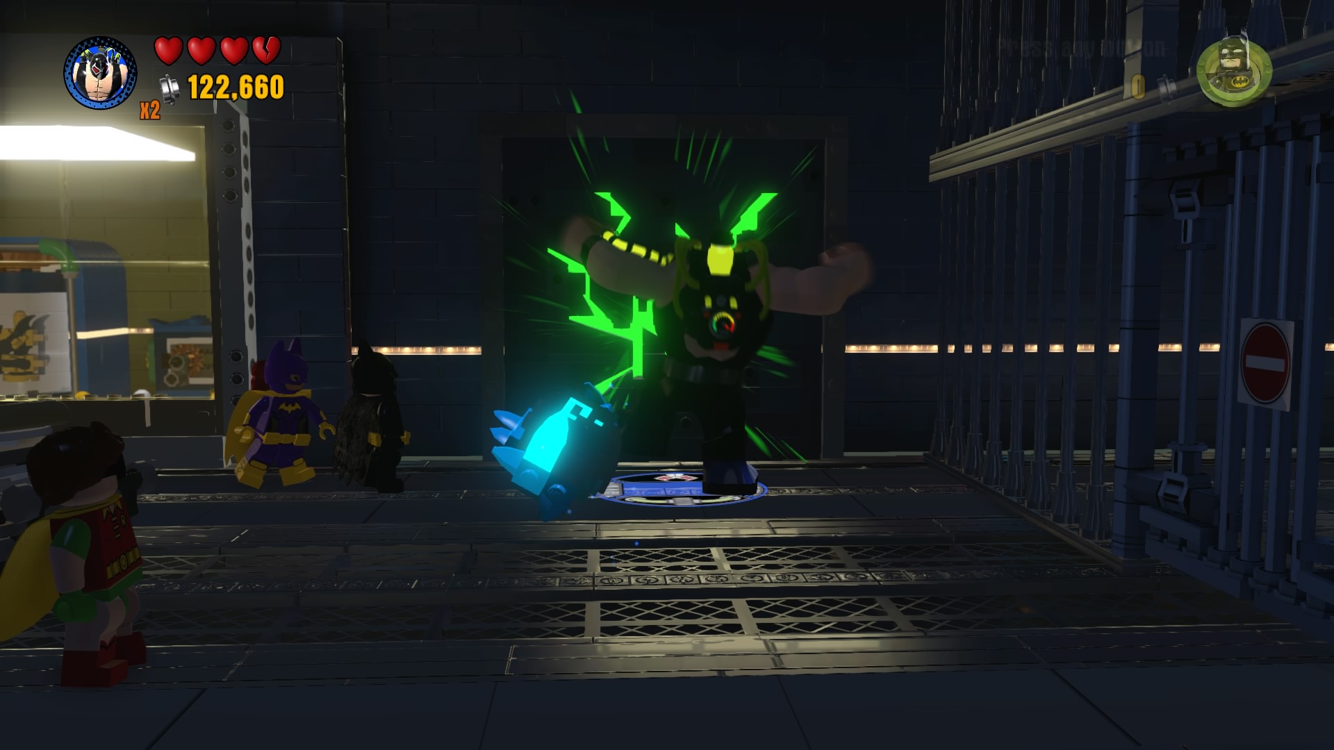 - Minikit #3: Take the stairs up from the Clayface cell to find three Minikits. Use a car (like the Batmobile!) on the charger station.