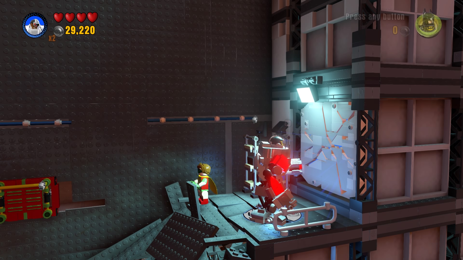 - Minikit #3: Climbing across the elevator shaft, go all the way right and use a giant LEGO hero to smash through the cracked wall.