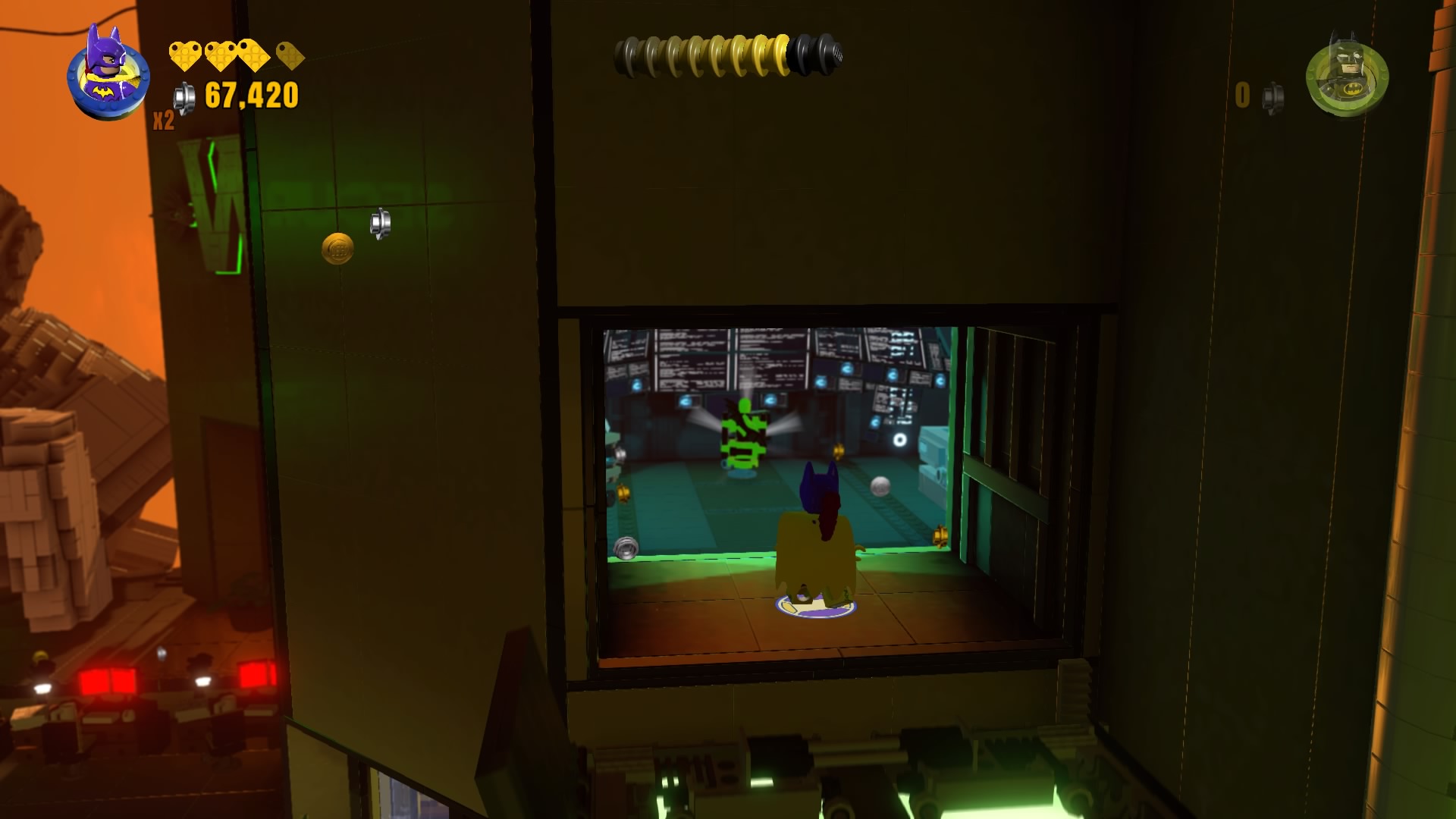 - Minikit #6: Break the glass to enter the office in the right corner of the Security Room, then use Batgirl on the terminal to lower an elevator. Ride up to find your green-hued collectible.