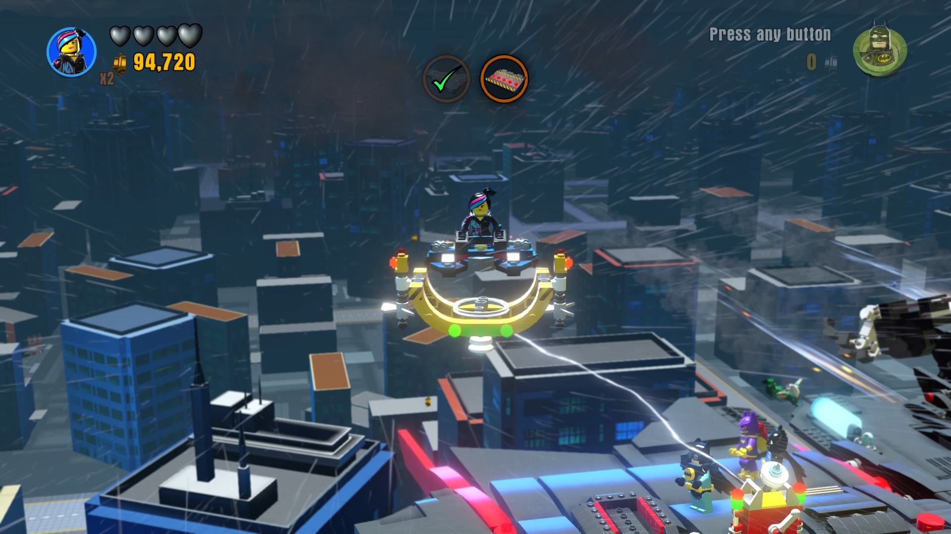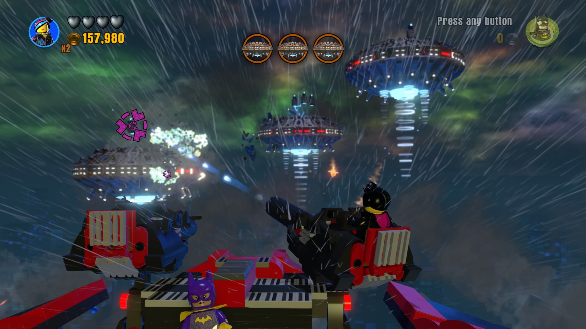 - Minikit #7: After reeling in the left wing of the Batwing, purple haze will appear for Wyldstyle to scan with her Relic Finder. Hop into the Batwing (the bite-sized vehicle version) and use the floating charger. with the Flight Dock ability. Build the hopping bricks that appear.