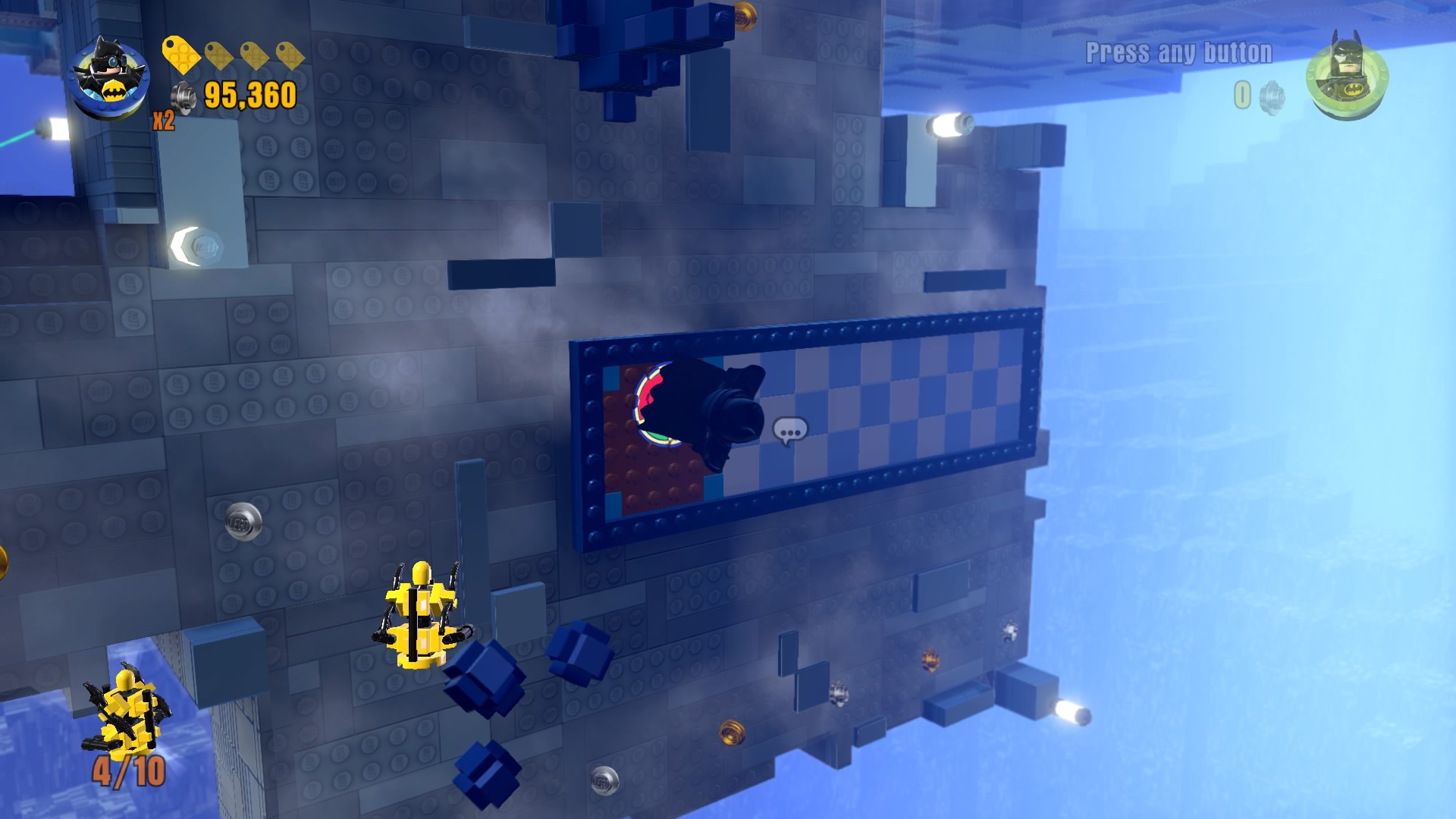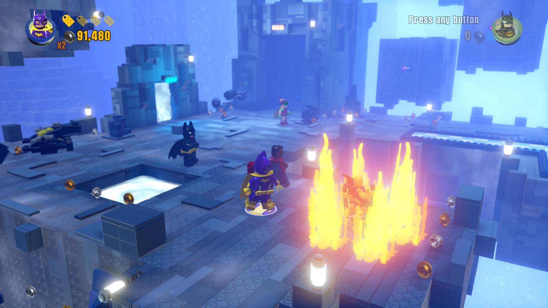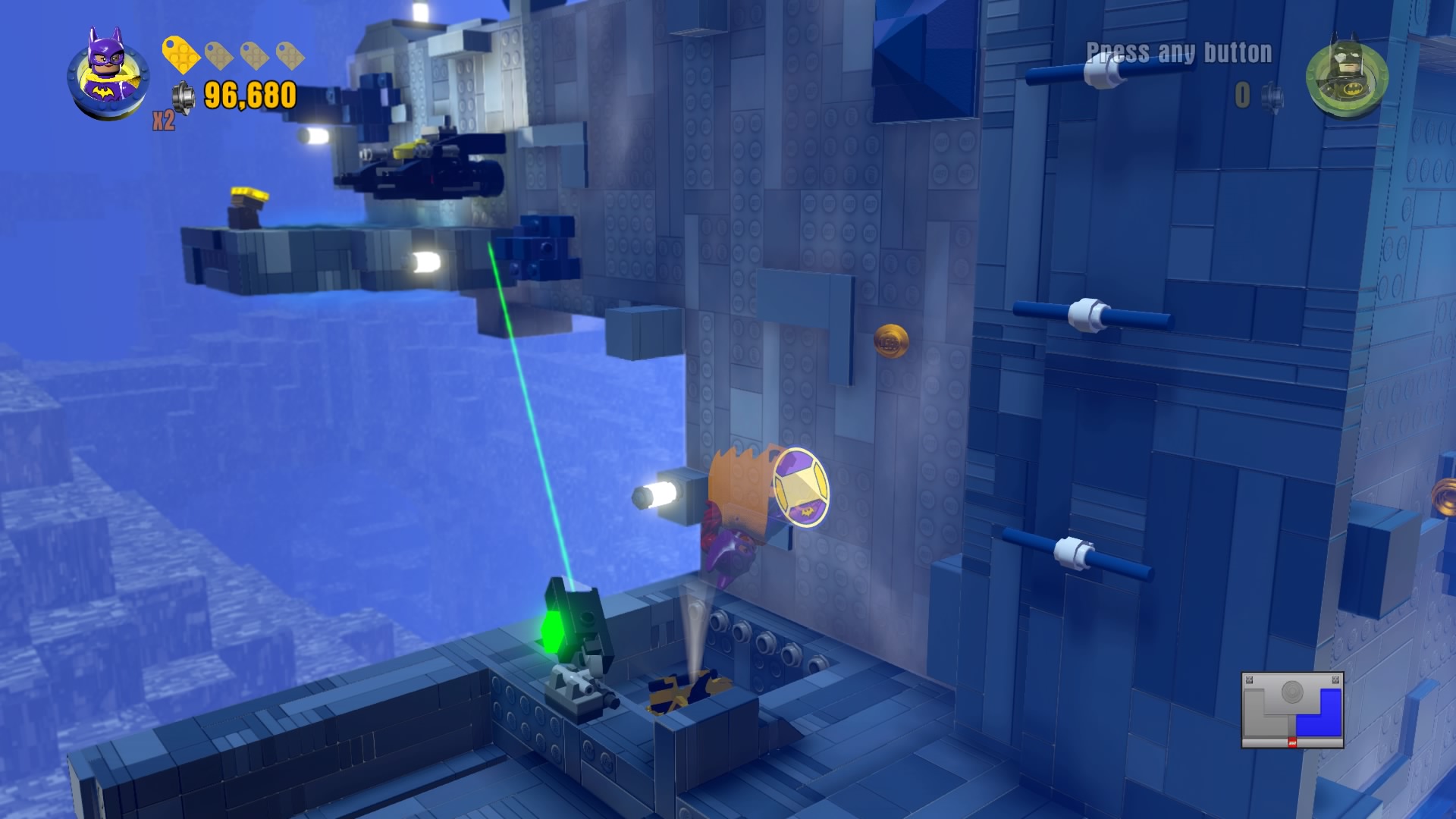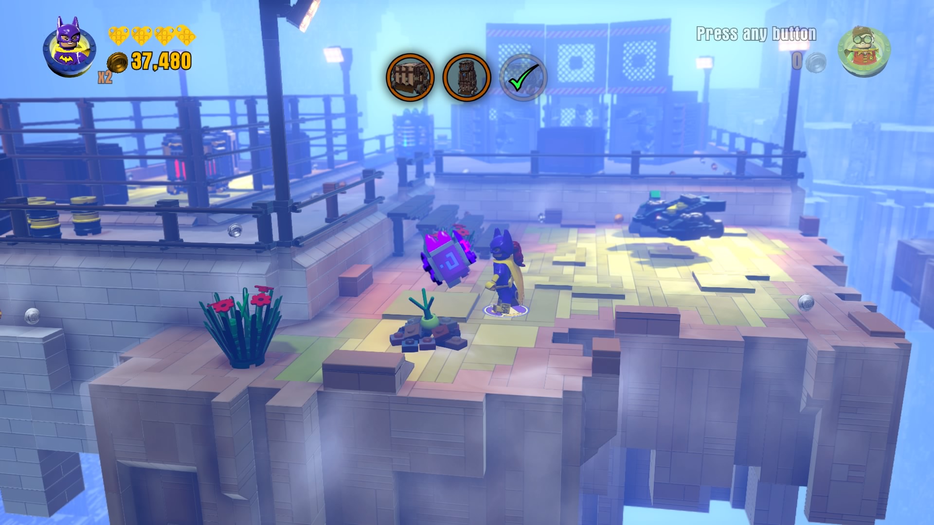 - Minikit #2: On the same rooftop, use a Hero with a laser (Cyborg, Superman) to melt the gold LEGO vent. Construct the bricks that pop out to create a well that delivers a fancy minikit.