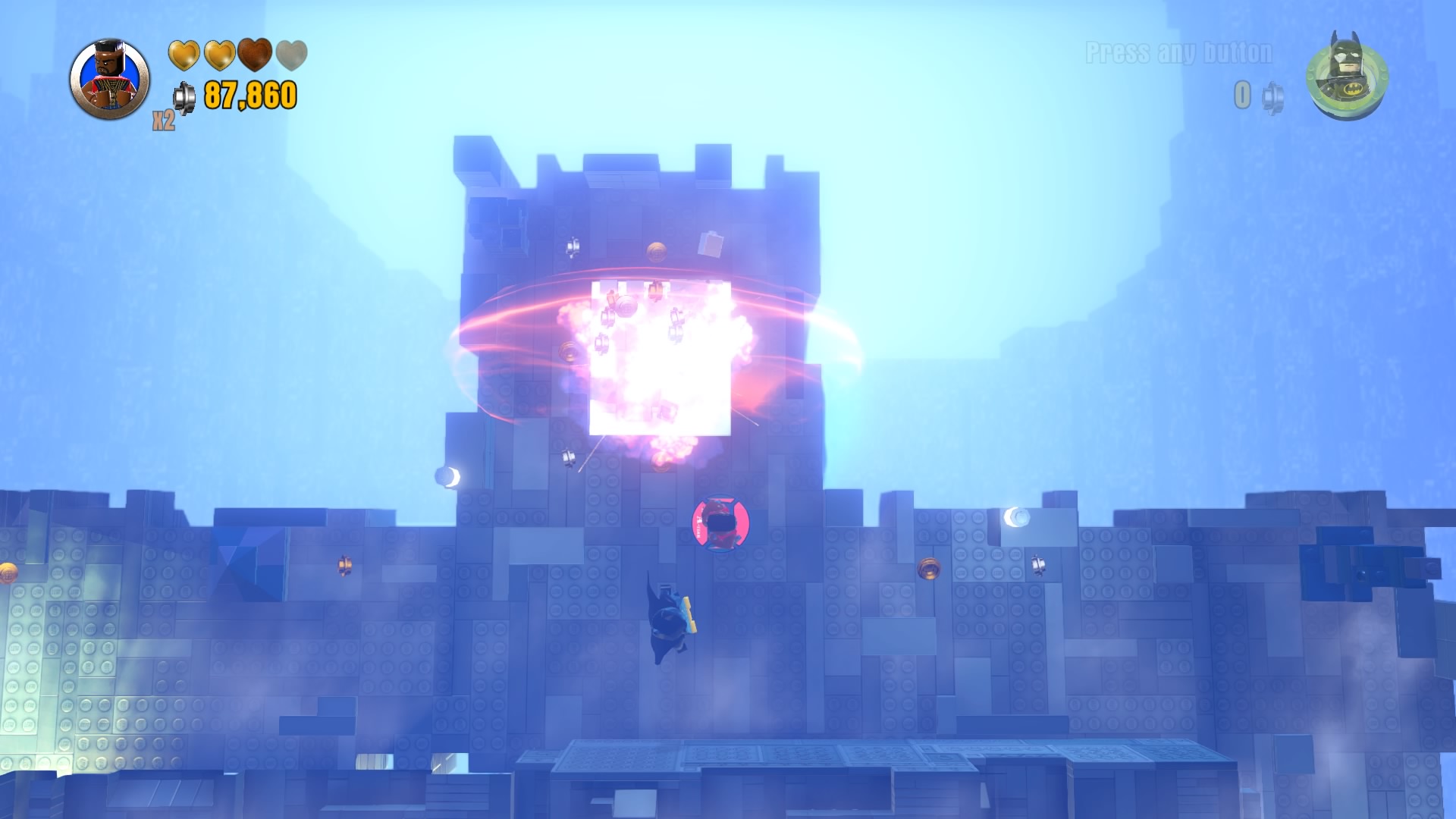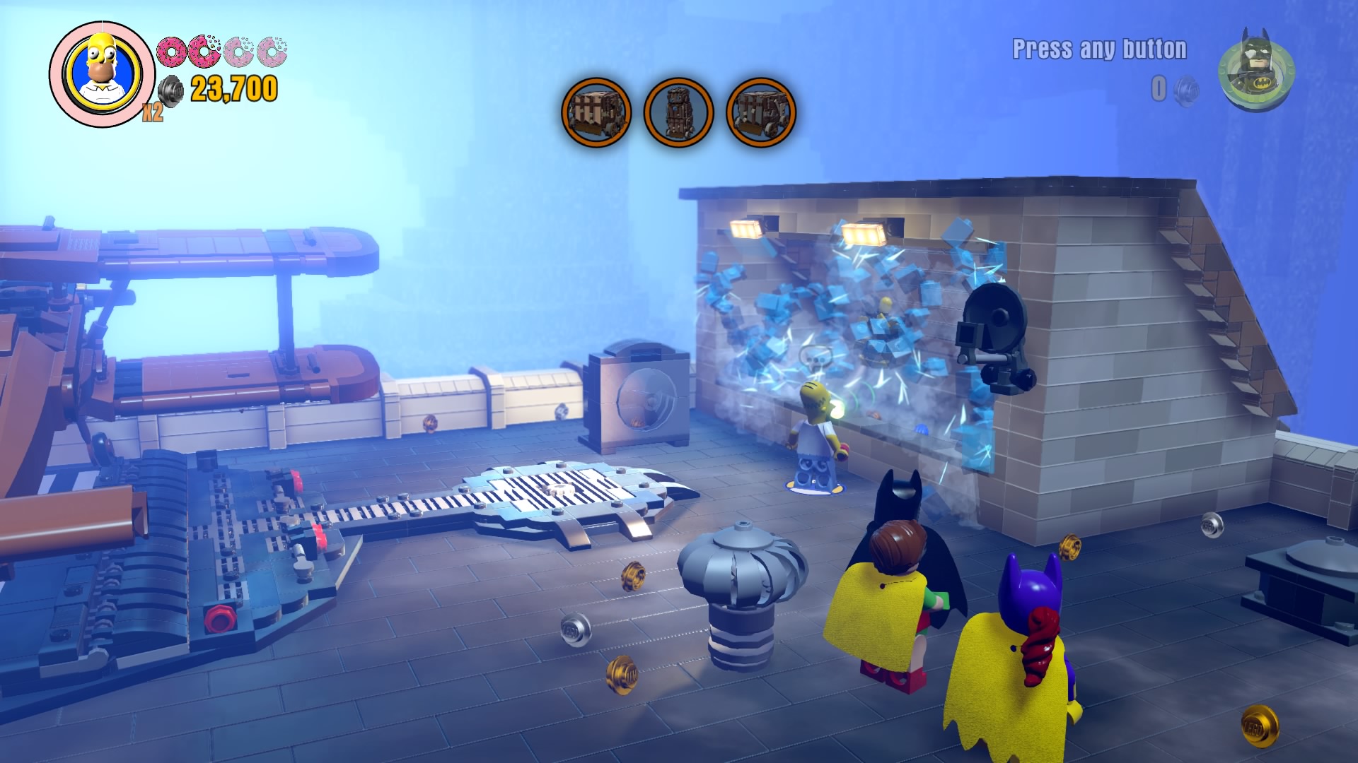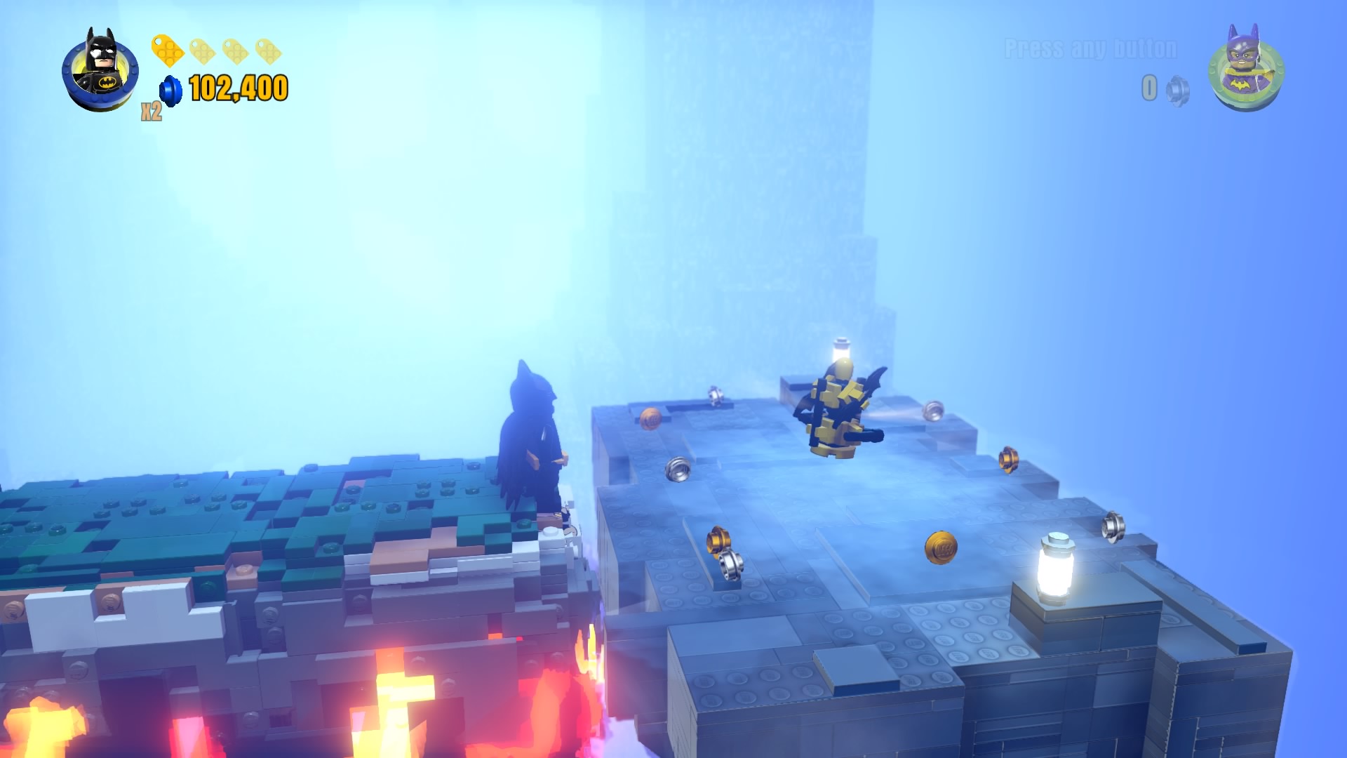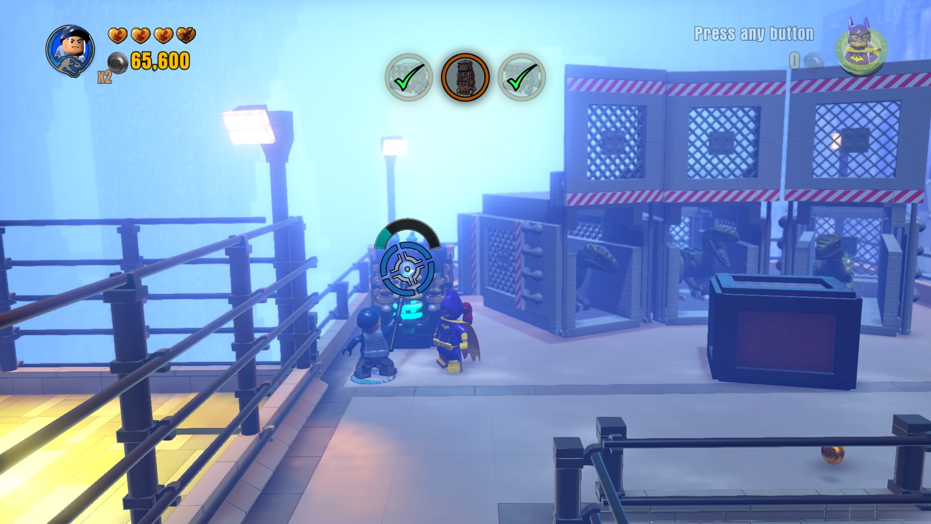 - Minikit #2: On the same rooftop, use a Hero with a laser (Cyborg, Superman) to melt the gold LEGO vent. Construct the bricks that pop out to create a well that delivers a fancy minikit.