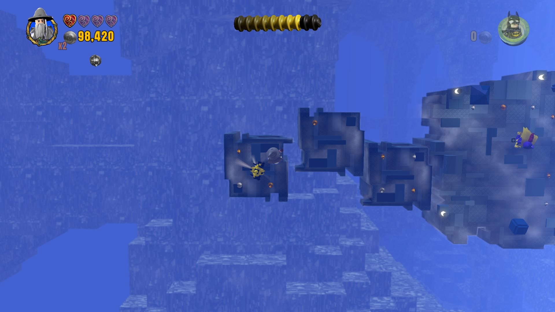- Minikit #9: Enter the (left) blue portal with Gandalf and run to the upper-left corner to find a flying platform. Use magic to create a pathway — after three platforms, a minikit will appear.
