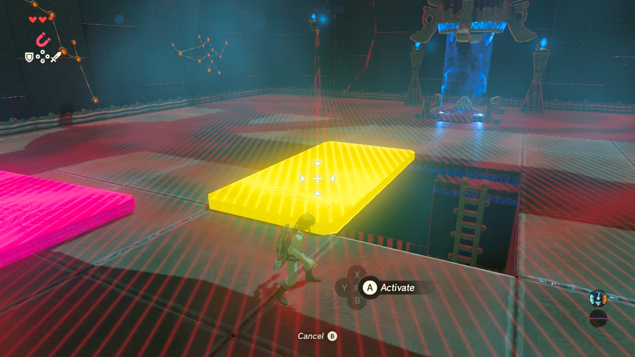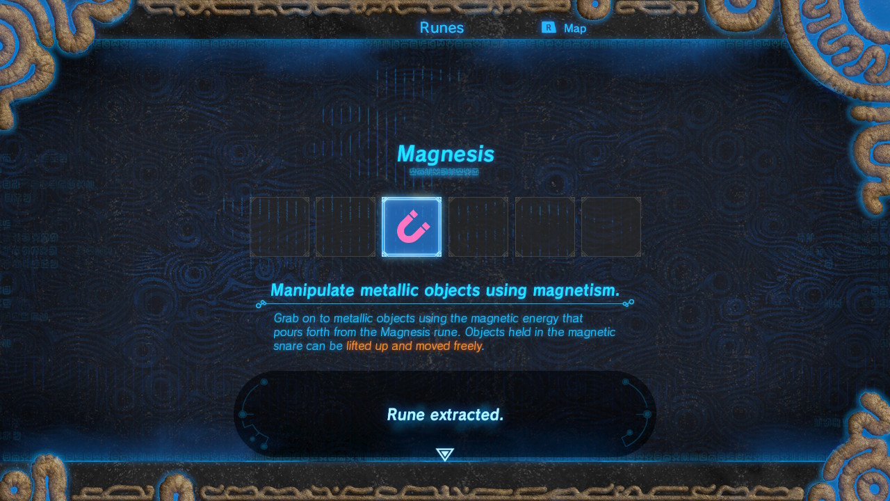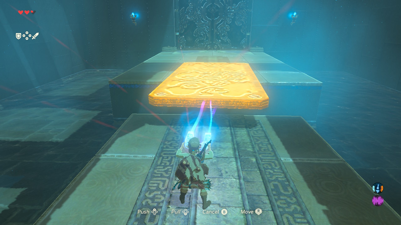 The first run unlocks when you use the Sheikah Slate on the terminal to the left of the blocked path. Magnesis allows you to lift and move metallic objects. Tap [R] then press [A] to move objects highlighted in red. Start with the two metal floor plates. Lift one up, then drop into the reservoir path.