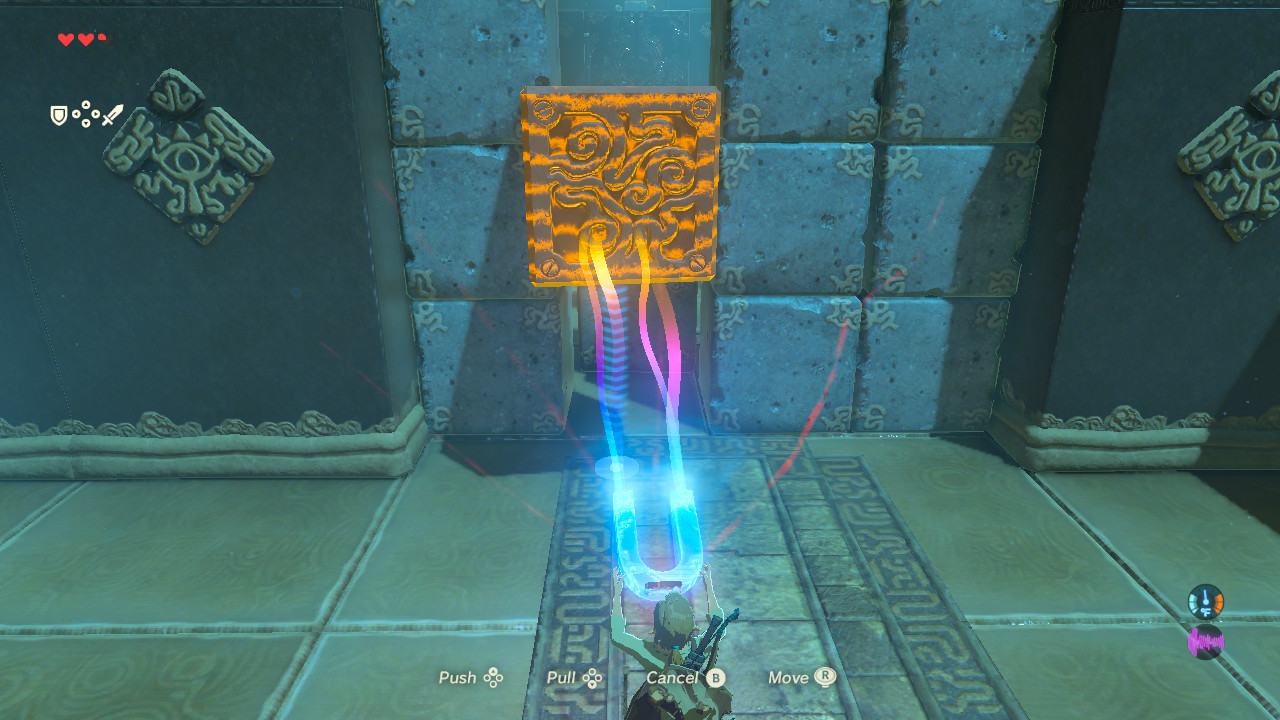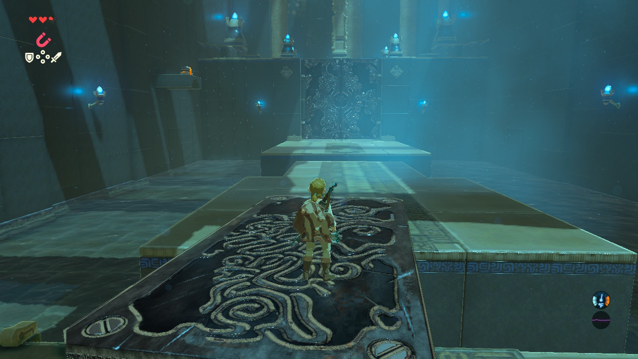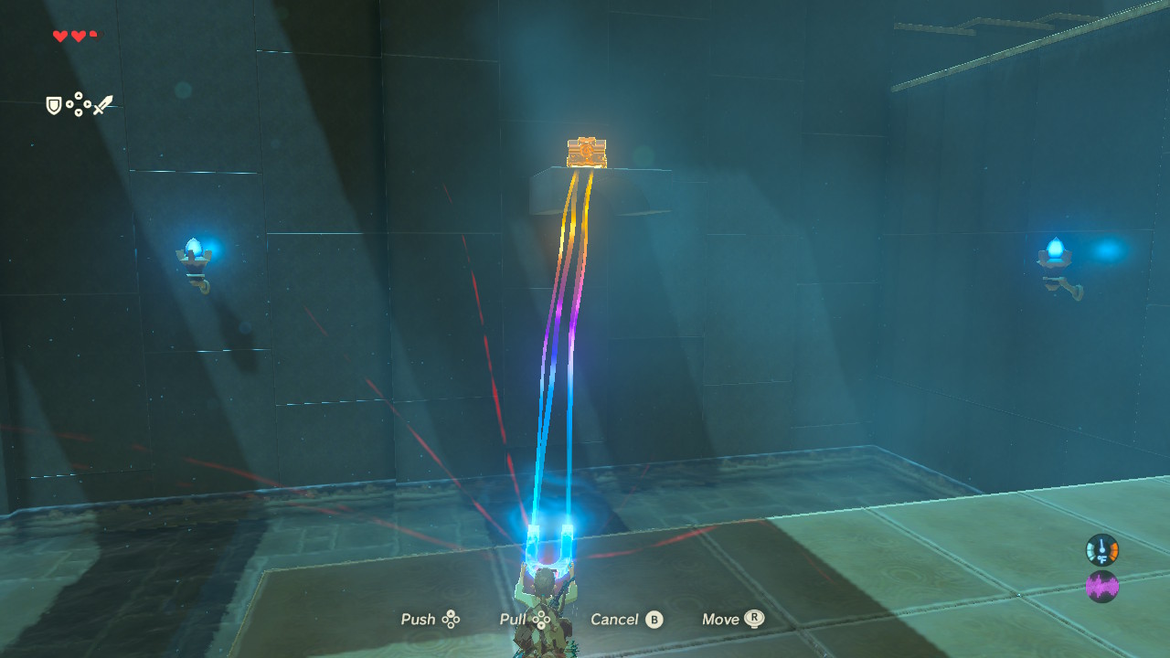 There’s a bridge ahead. Cross the metal plate, then use Magnesis to cross the second gap. Don’t miss the treasure chest on the platform to the left of the huge doors. Use Magnesis to grab it and bring it down for a prize.