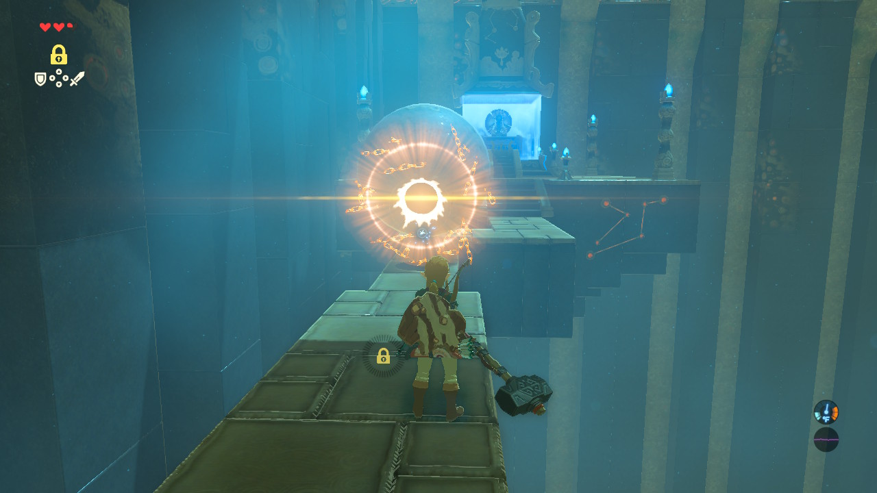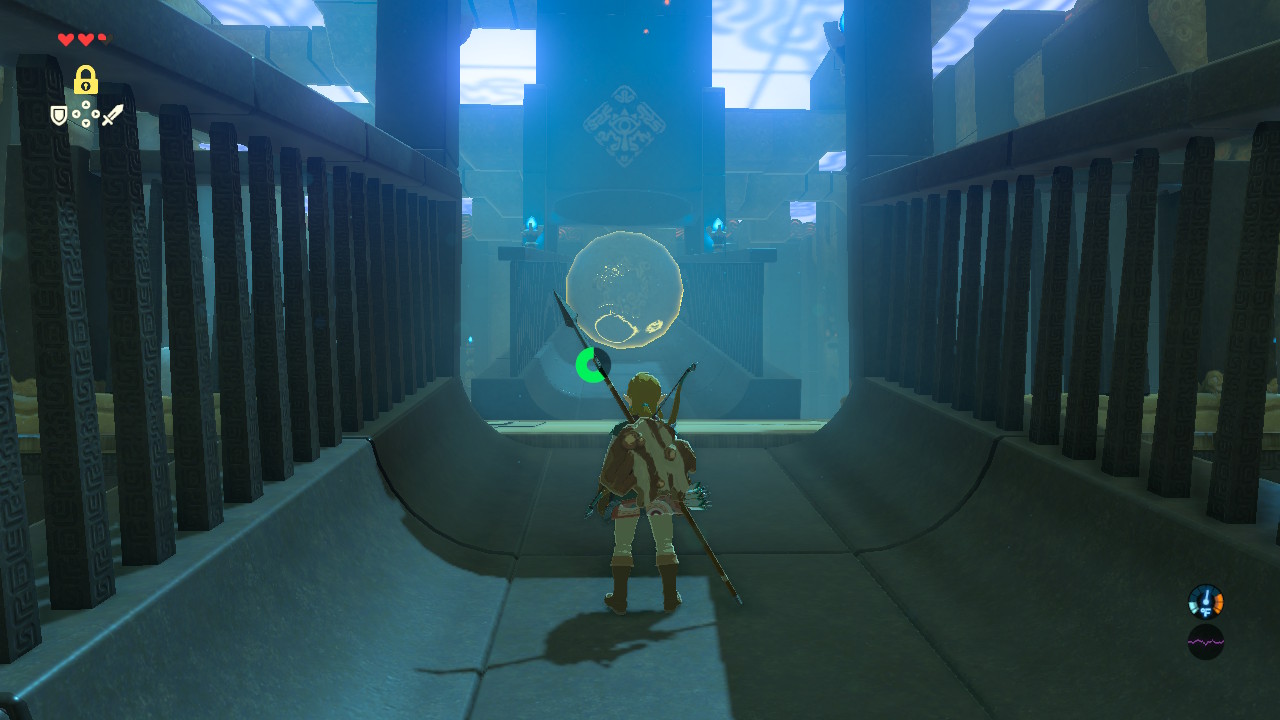 Activate Stasis and use it to freeze the gear to create a bridge across the gap. Ahead, use Stasis to freeze the rolling boulder. There’s a treasure chest at the top of the second ramp where the boulders drop down — freeze another boulder when you’re closer to run up and get the Traveller’s Shield.