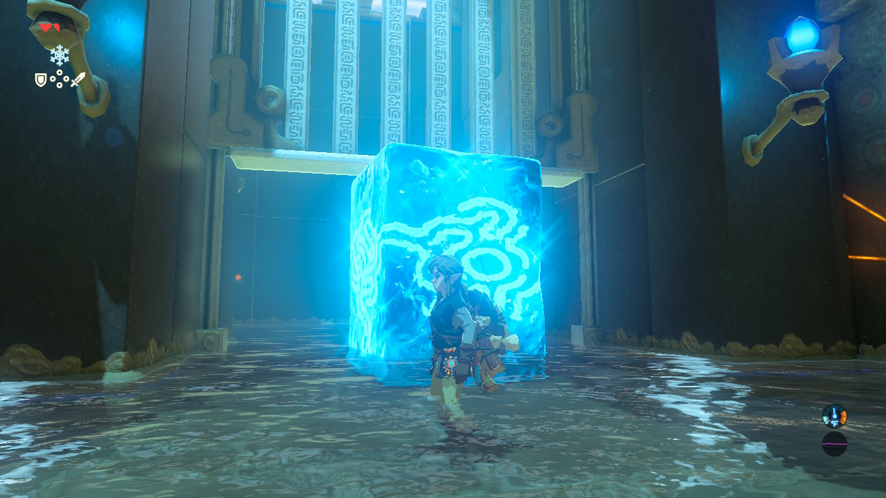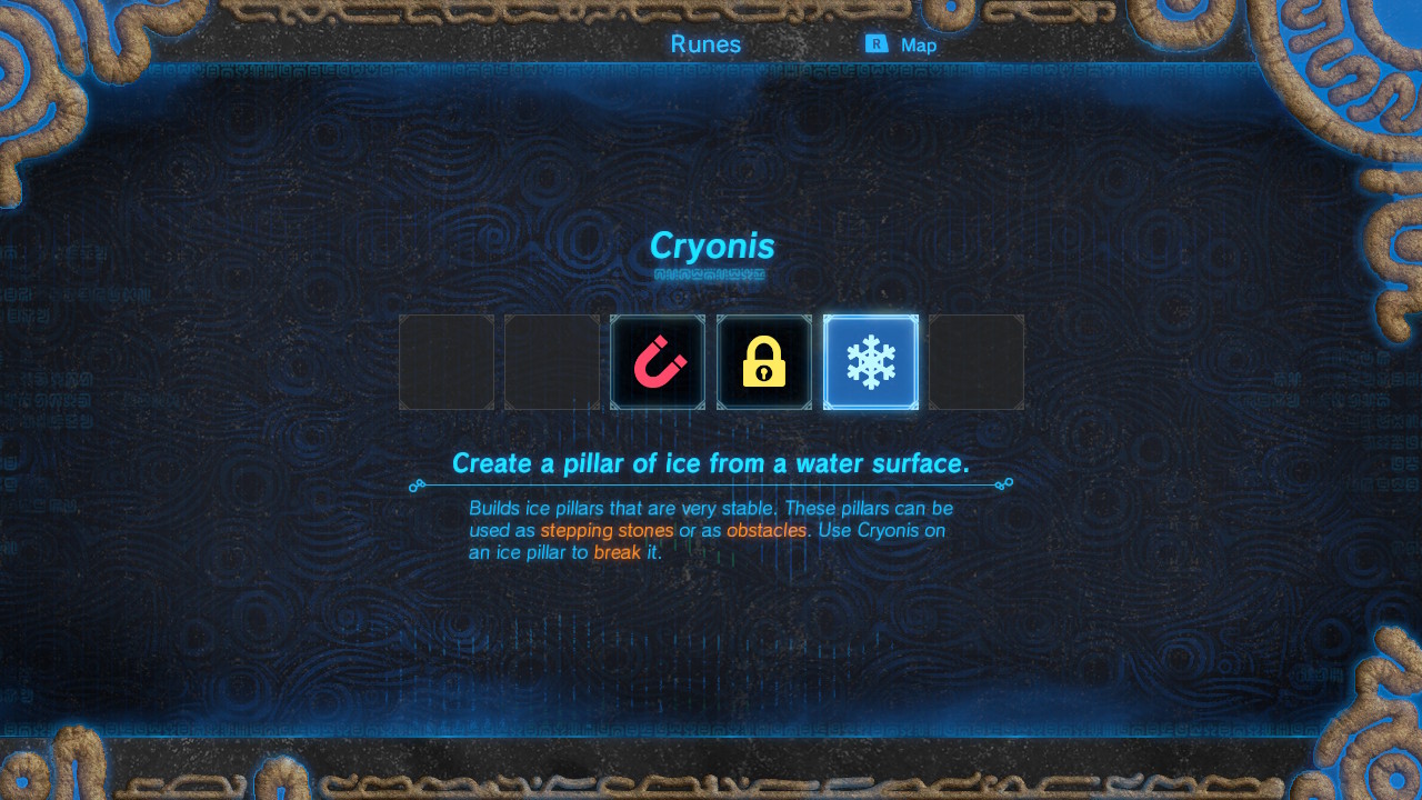 This ability creates pillars of ice from the water. Use to rise up Link, create a barrier or stepping stone, or to push open gates. Use the Sheikah Terminal to unlock the power, then place your first Cryonic pillar close to the high ledge. You can either place the pillar underfoot, or climb the pillar.