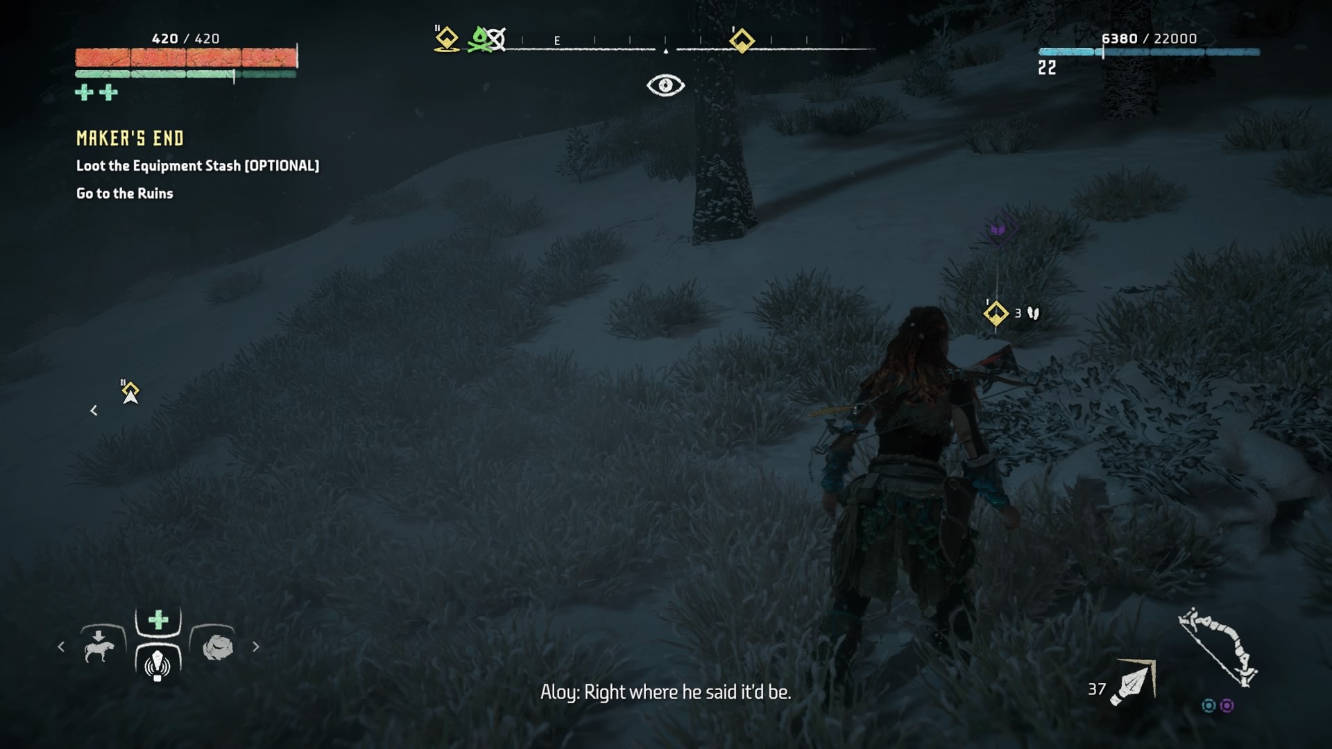 Once you get to the site, a couple of guards and a watcher will be prowling around. Make sure not to stir them up unless you want a big fight. Pick them off one by one. Once you’ve cleared the camp, head to the ruins and watch out for more guards and machines. There is even a corruptor, so stay as stealthy as possible.