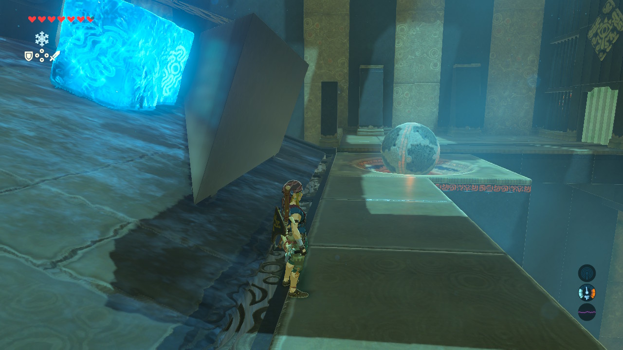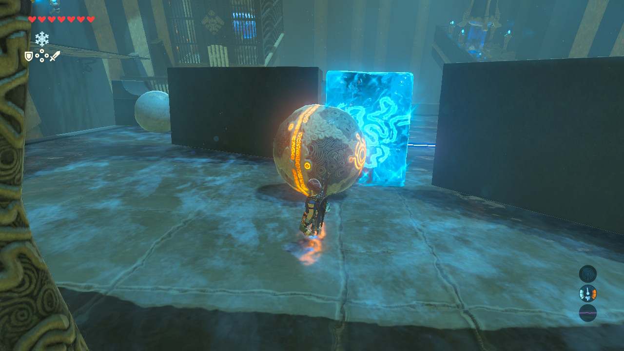 This simple shrine presents a problem — your energized ball is at the top of the ramp and you need to push it down to reach the input near the altar’s cage. Run to the top of the gauntlet of falling stone boulders to get to the ball.