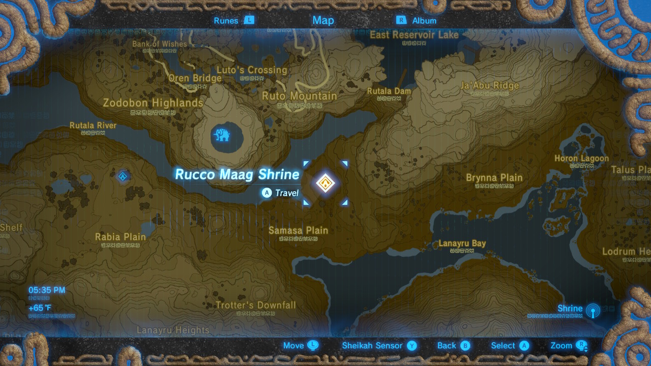 Find this shrine north of Samasa Plain on the banks of the Rutala River. It’s surrounded in spikes. Navigate the spike maze, or paraglide into the area from one of the nearby bluffs.