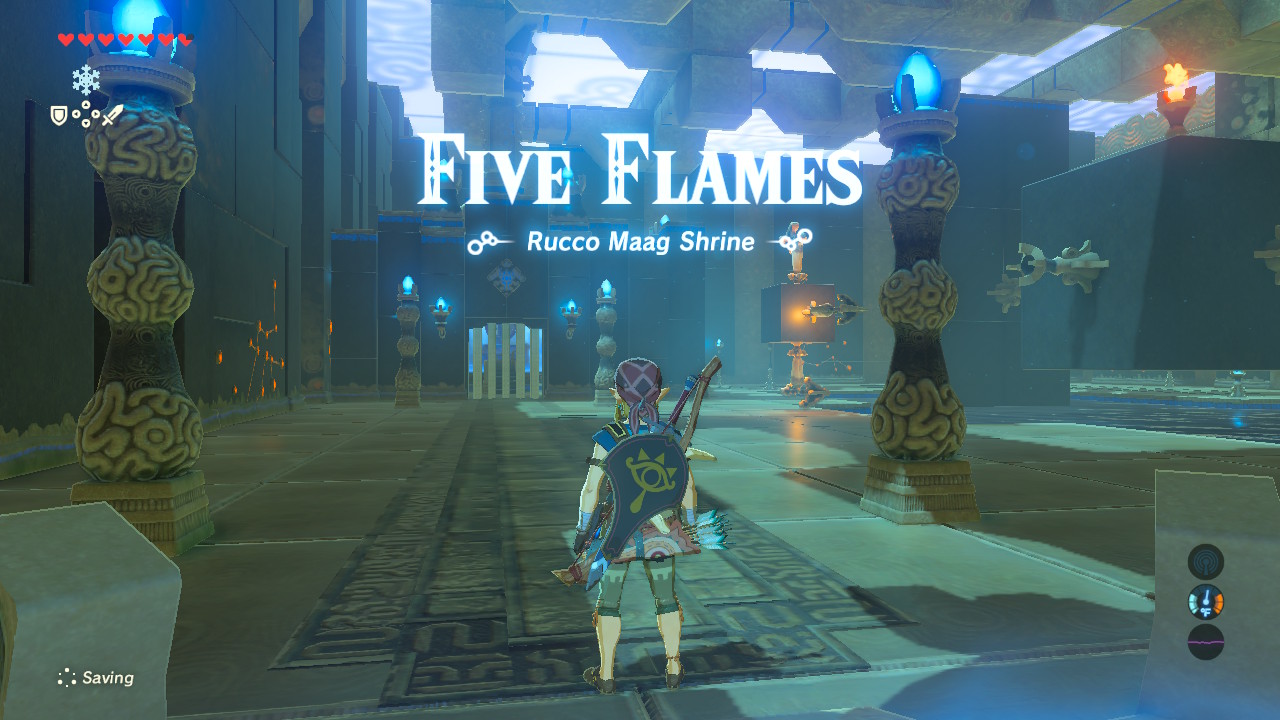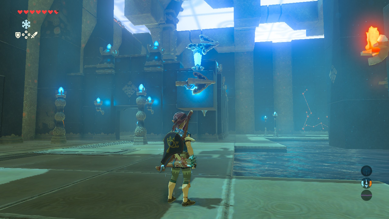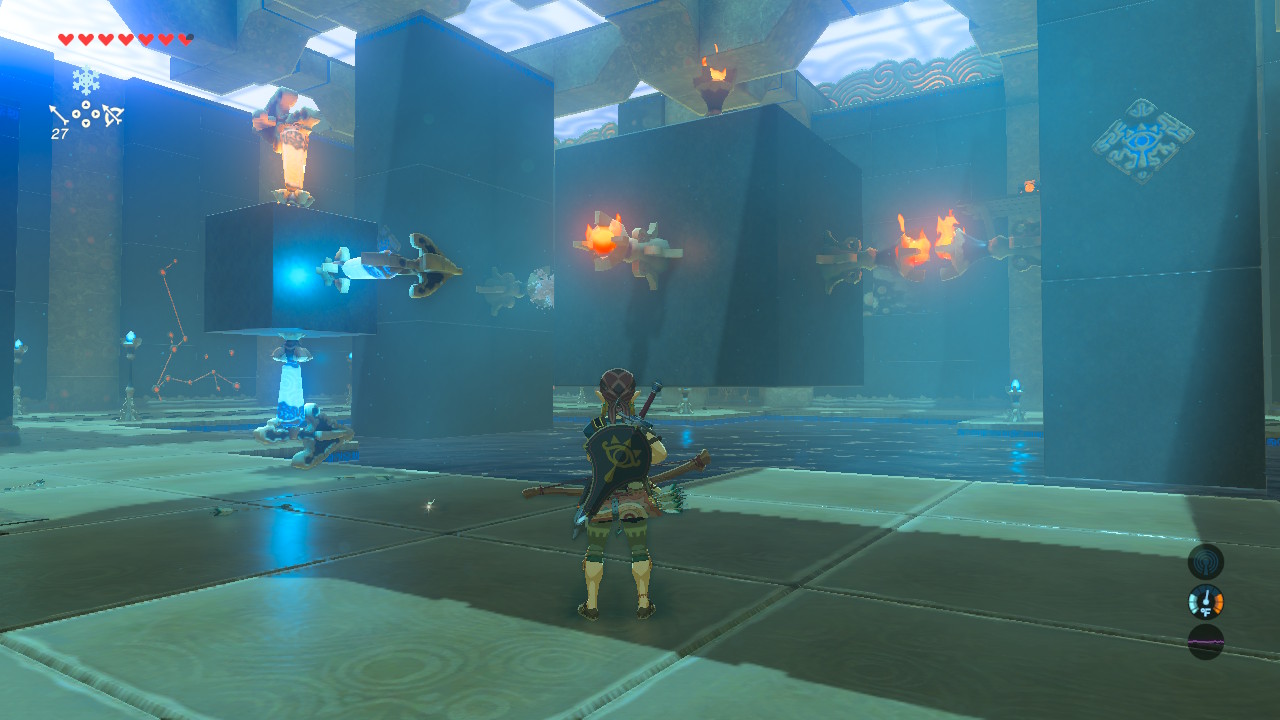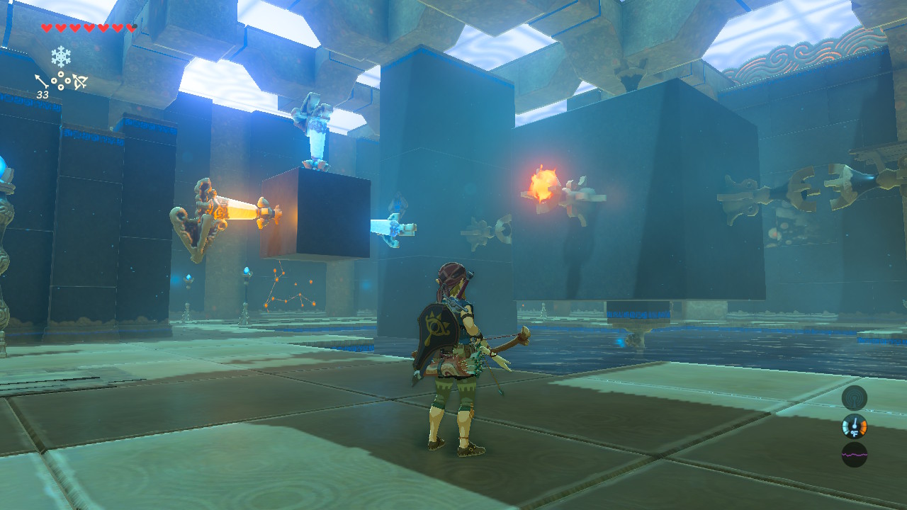 To solve this puzzle, you’ll need to shoot the pointer-switches with arrows, which in turn revolves the large block. Each face of the block has a brazier that can be lit, an empty space, or a fountain of water. Your goal is to light five braziers, all at once.