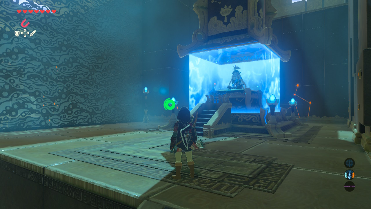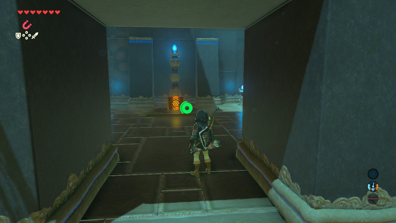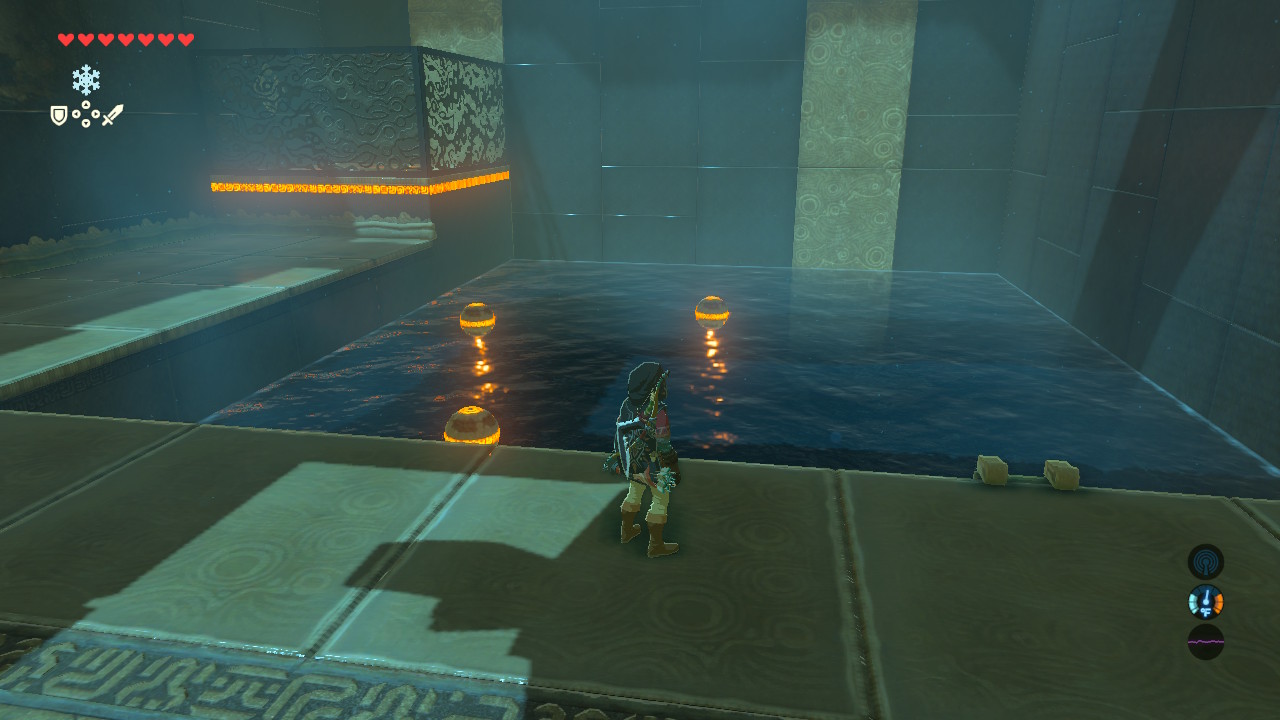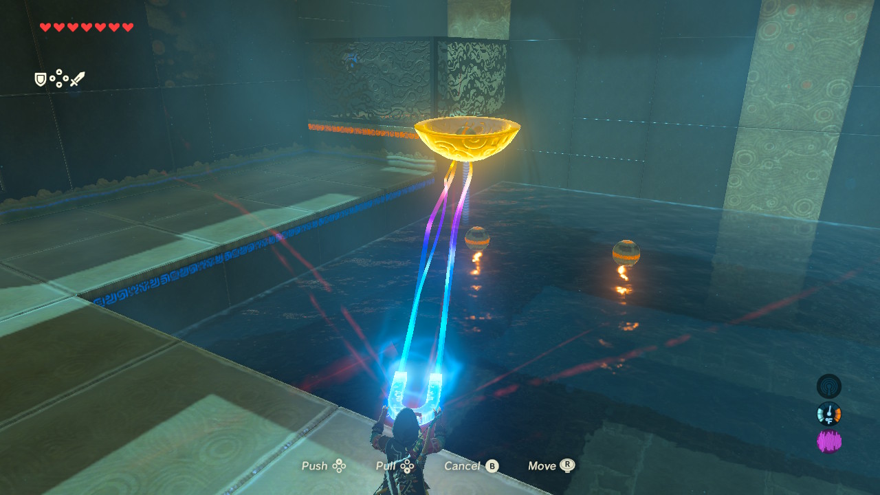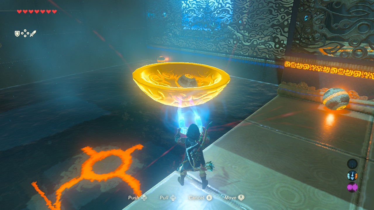 The title says it all — use Magnesis to scoop up one of the orange glowing balls and dump it into the funnel input in the corner of the chamber. Just one is all you need.
