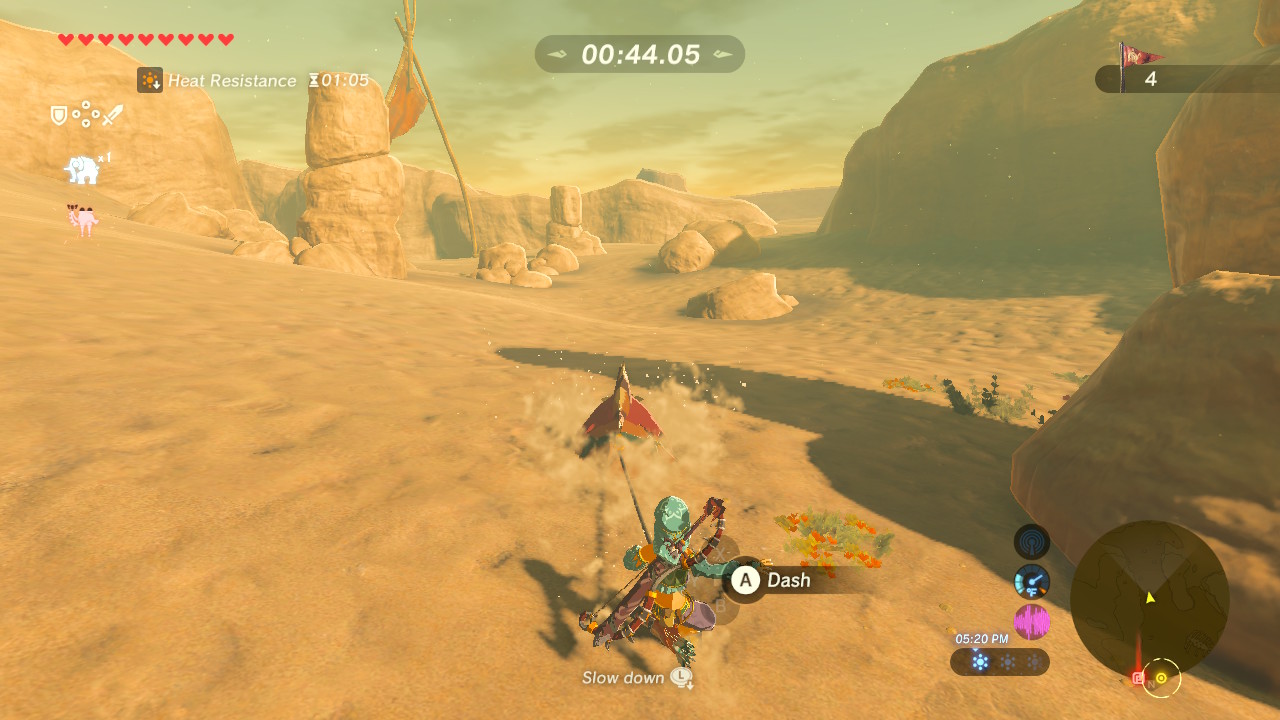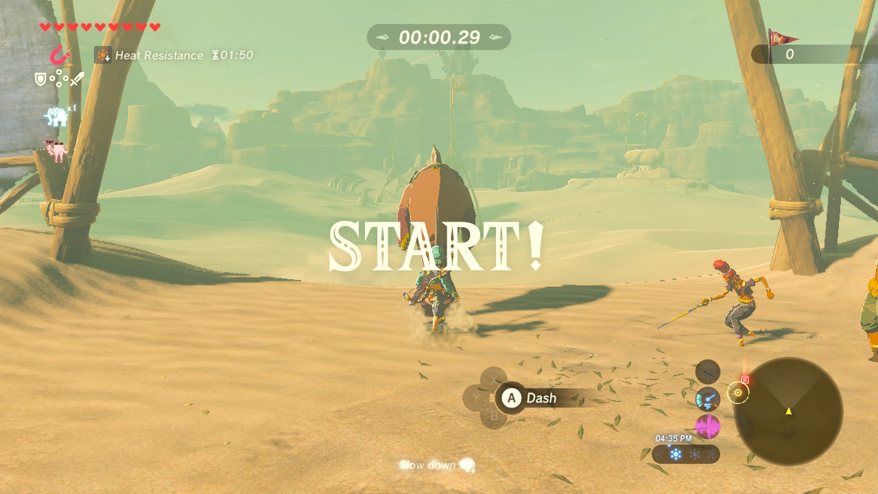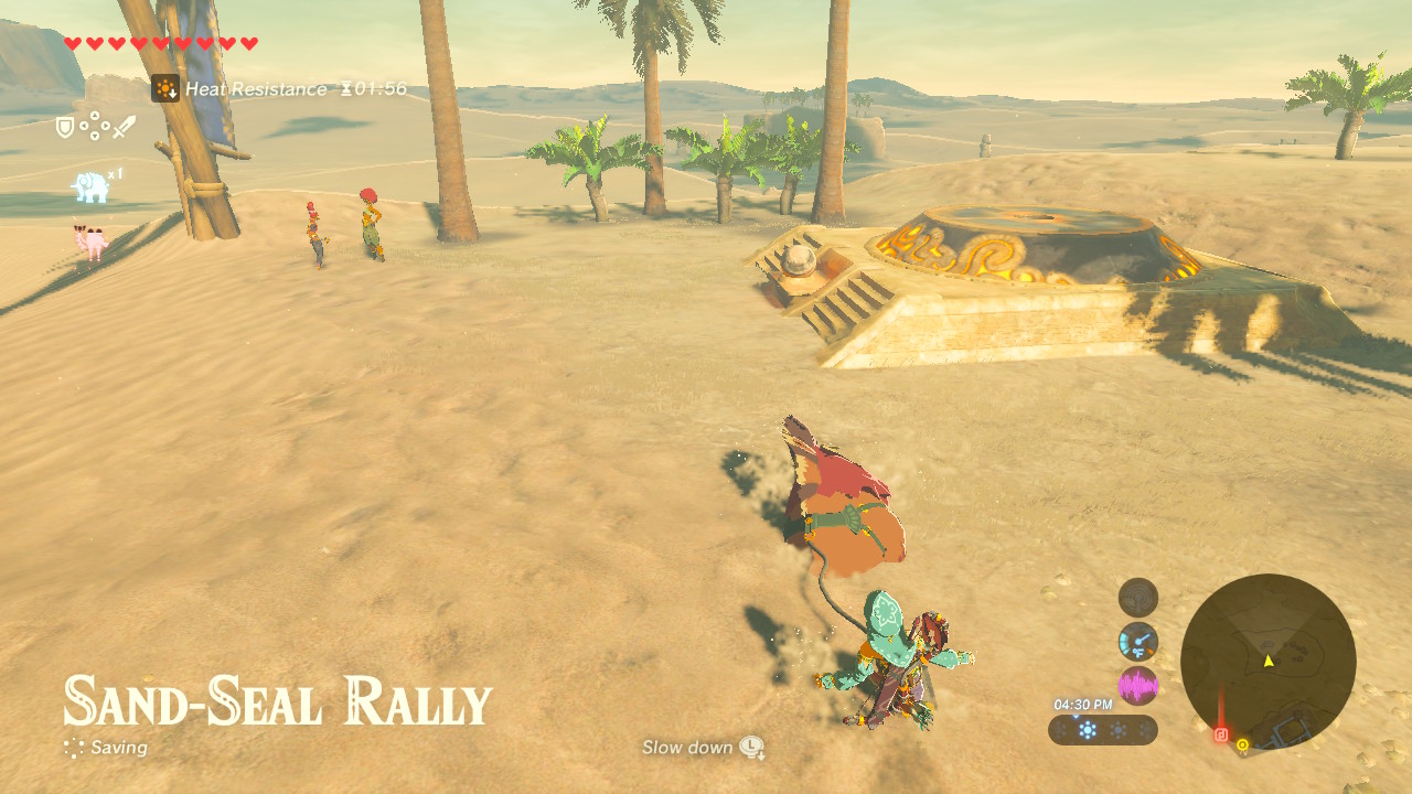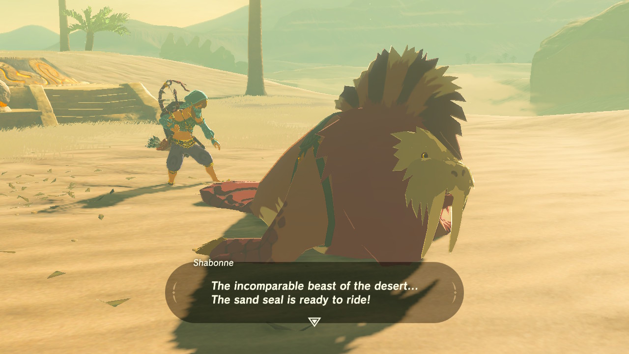 Rent a Sand Seal from Gerudo Town and begin the race. Shabonne charges 60 rupees per attempt. To win, you’ll need to complete the track in 1:30. Follow the arches and keep your Sand Seal dashing — you’ll have to periodically press [A] to keep that seal motivated.